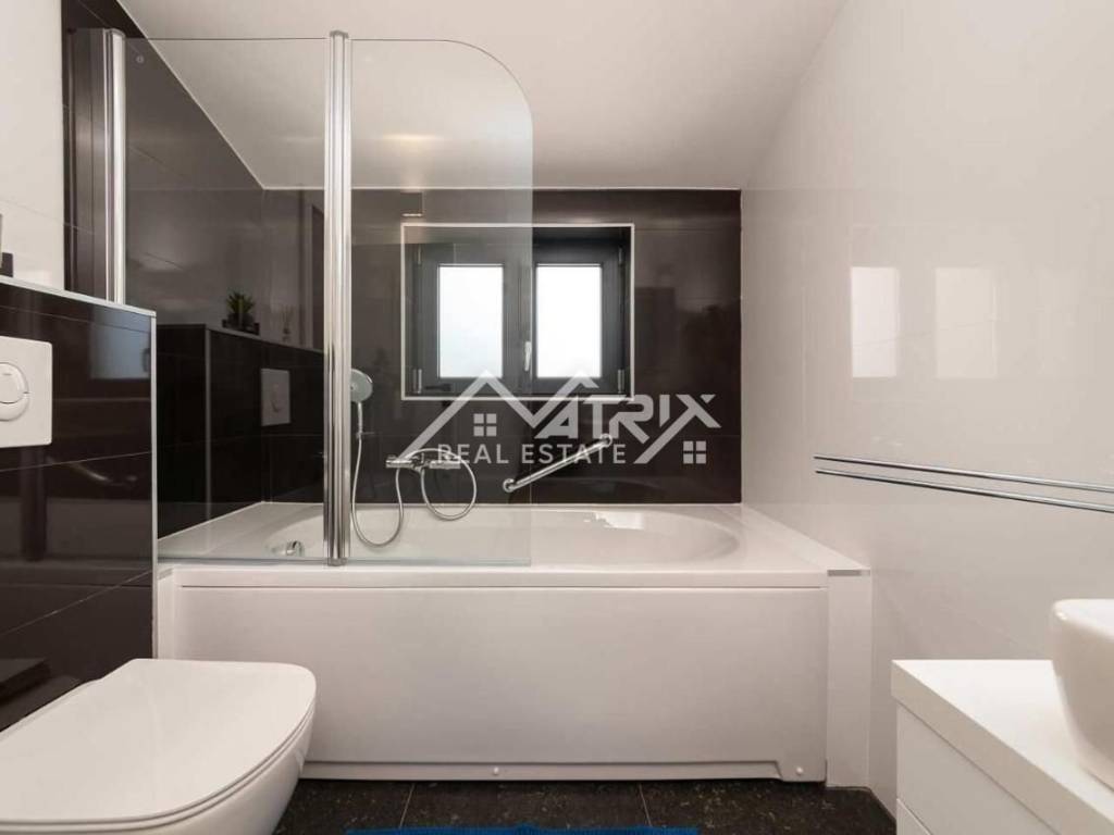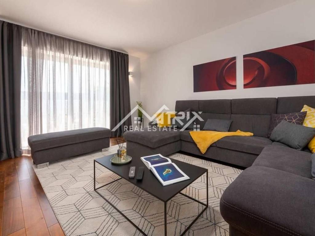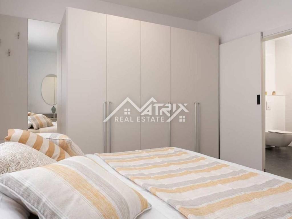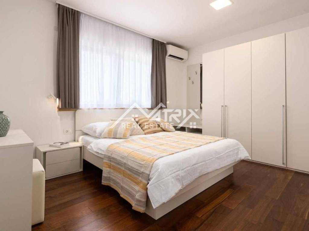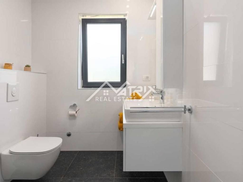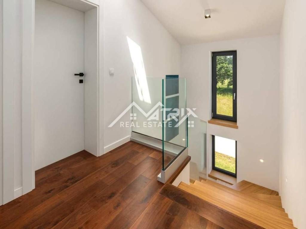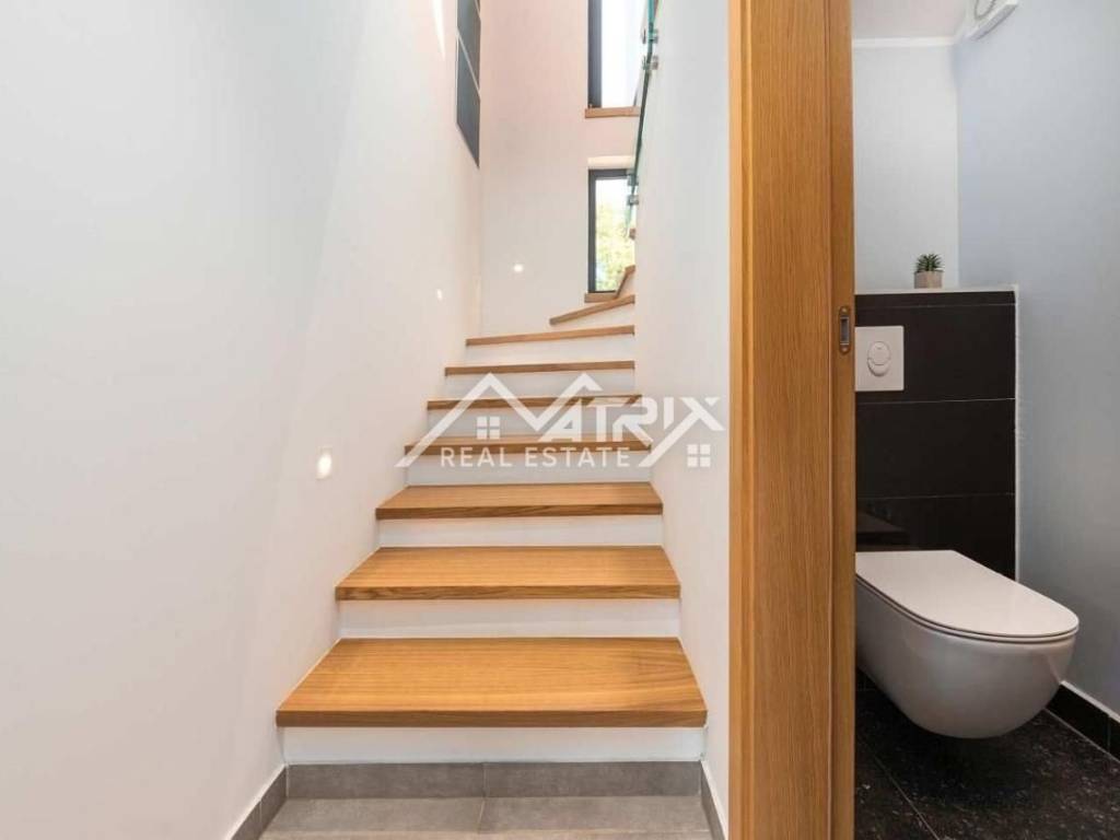 Vila ima ukupnu stambenu površinu od 145 m2 i prostranu okućnicu površine 470 m2 te se proteže na dvije etaže, pružajući maksimalan komfor budućem vlasniku. U prizemlju vile nalazi se prostrani dnevni boravak i potpuno opremljena kuhinja s blagovaonicom. Velike staklene stijene omogućuju obilje prirodnog svjetla tijekom cijelog dana, a dnevni boravak i blagovaonica imaju pristup terasi bazena. Također, u prizemlju se nalazi gostinjski WC. Na prvom katu ove prekrasne vile nalaze se tri udobne spavaće sobe, od kojih svaka ima vlastitu kupaonicu. Master spavaća soba ima privatnu terasu s pogledom na prirodu i djelomično na more.