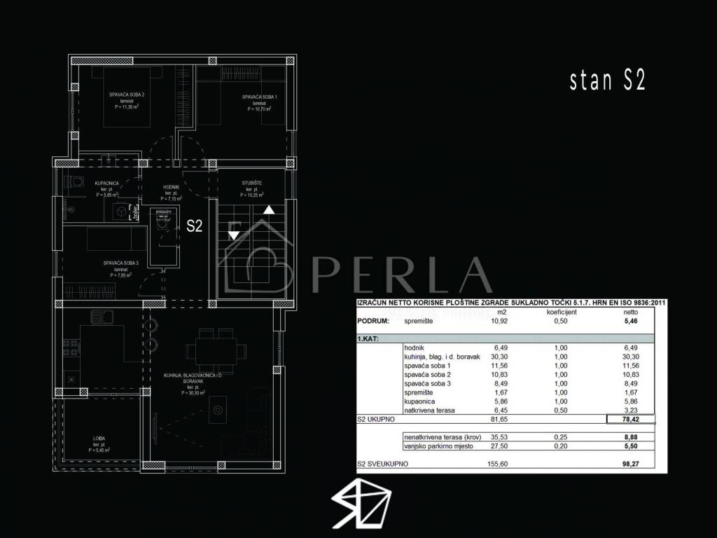 S2 - trosoban stan S2 (98,27 m2) na 1. katu s pripadajućom krovnom terasom - 478.800,00 €