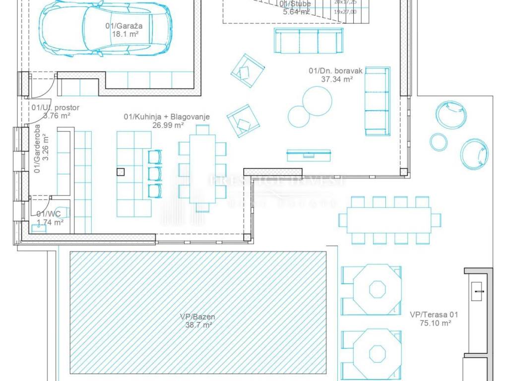 Garaža (18,1 m²), ulazni prostor, garderoba, WC, kuhinja s blagovaonicom i prostrani dnevni boravak s izlazom na natkrivenu terasu i grijani bazen.