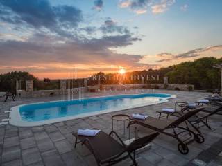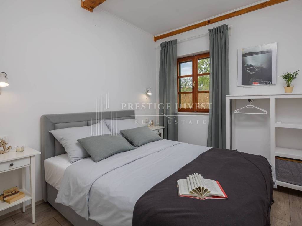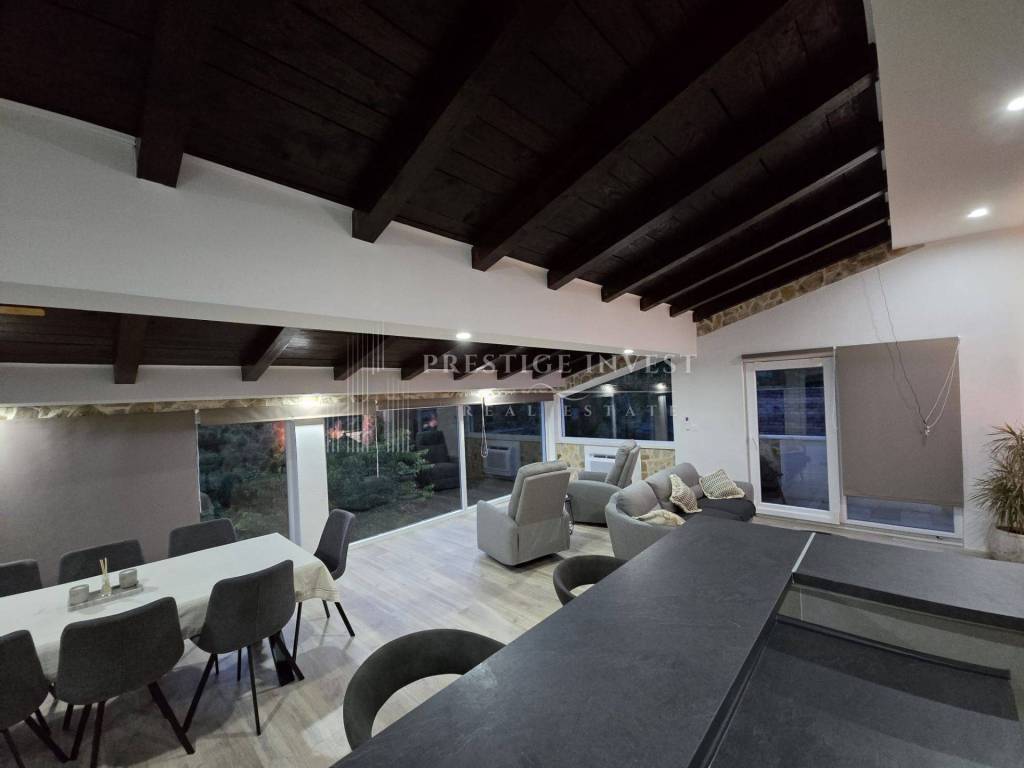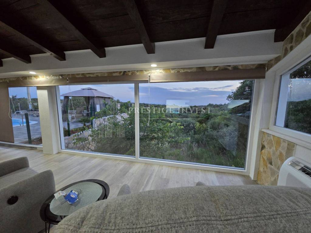 Na prodaju je moderna kamena kuća s prostranom okućnicom, bazenom i panoramskim pogledom na more. Nekretnina je smještena nedaleko od malog turistikog mjesta Rogoznica.
