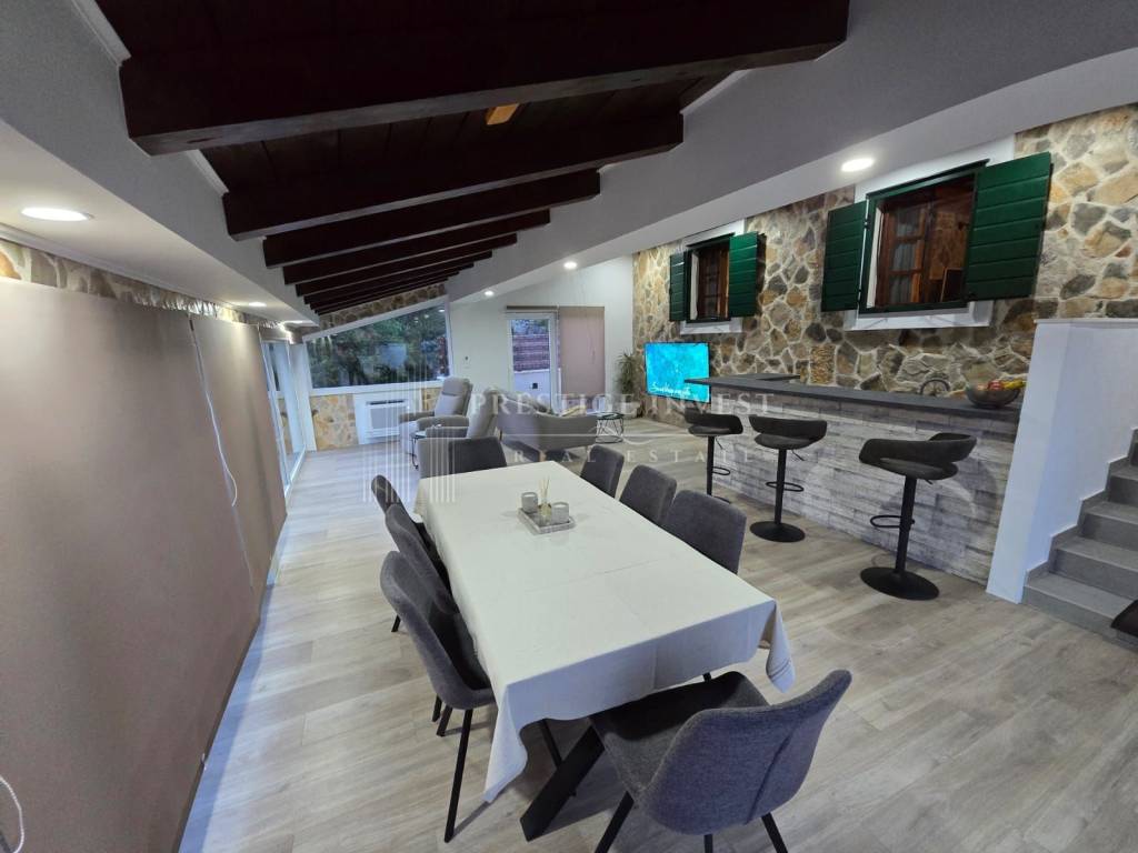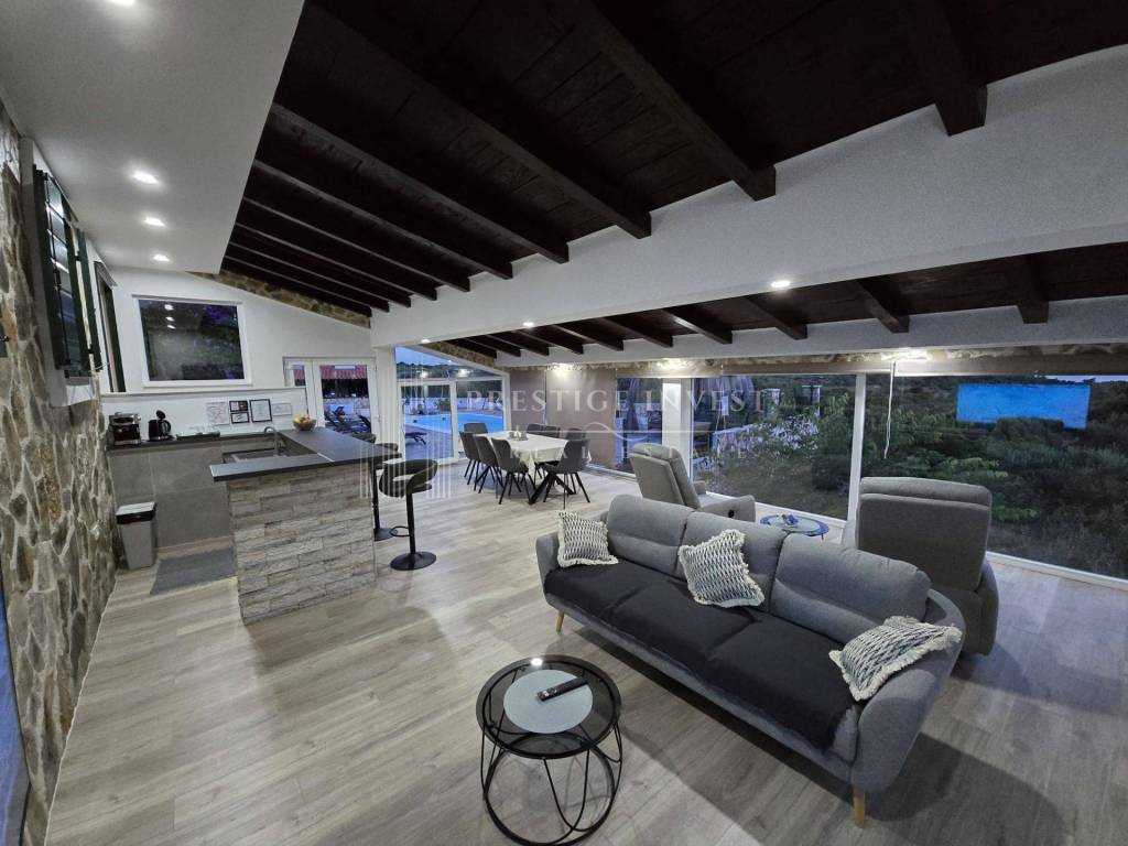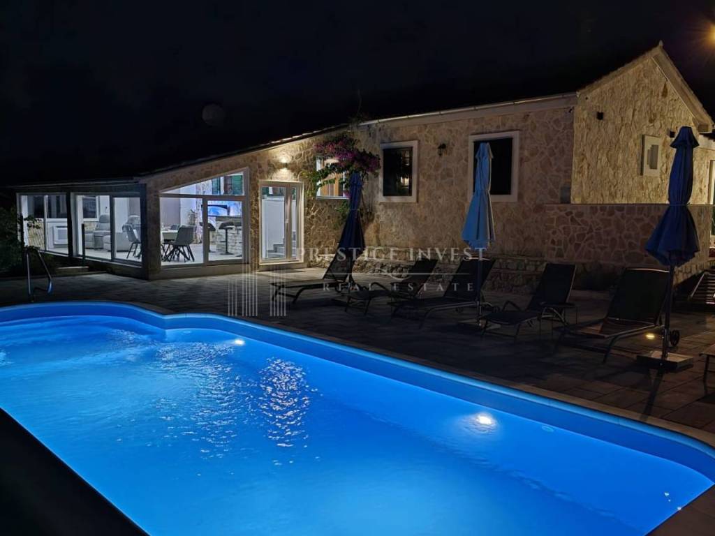 Osnovne informacije: Stambena površina: cca 150 m² Površina zemljišta: cca 800 m² Broj spavaćih soba: 3 Dnevni boravak: 2 (unutarnji i vanjski) Kupaonice/WC: 4 (3 unutarnja + 1 vanjski s dodatnim spremištem) Bazen: dimenzije 9,80 m x 3,50 m Natkriveni vanjski prostor s roštiljem Parking: kapacitet za 5 do 7 vozila Grijanje i hlađenje: sve sobe su klimatizirane (sustav grijanja putem klima uređaja) Izvrsna lokacija s otvorenim pogledom na more