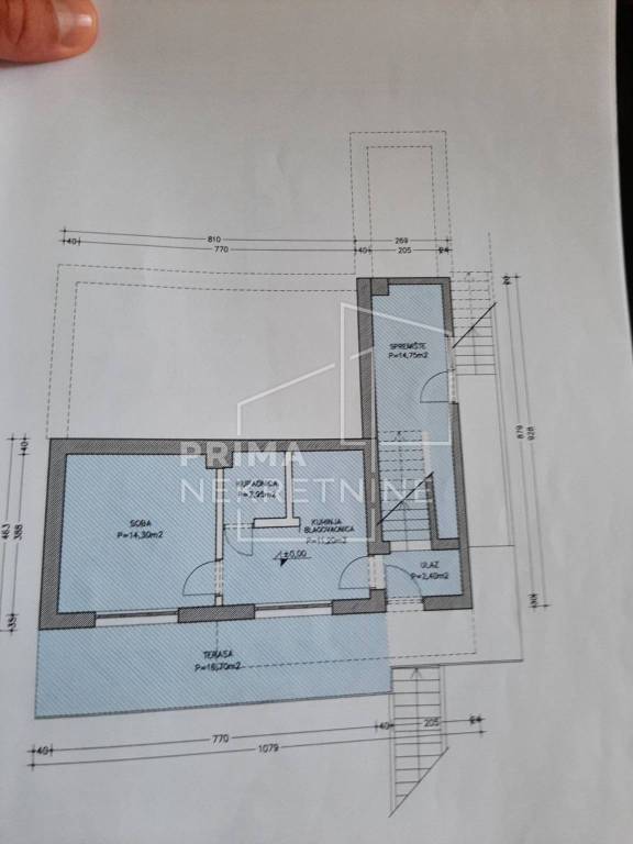 Pripada mu i spremište površine 14.75 m2 koje se koristi kao gospodarski prostor (perilice rublja, sušilica, bojler za plinsko etažno grijanje i sl.)