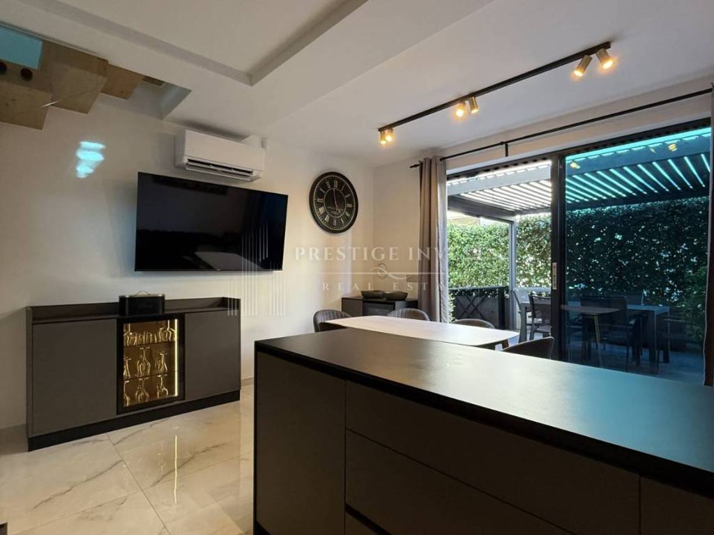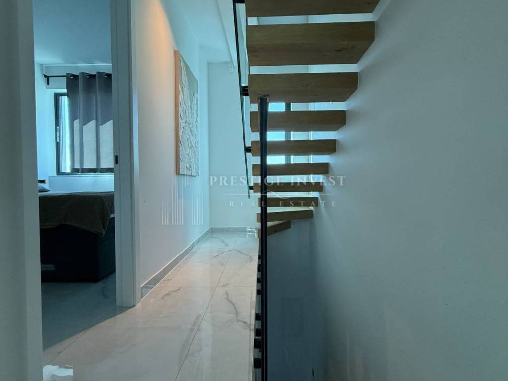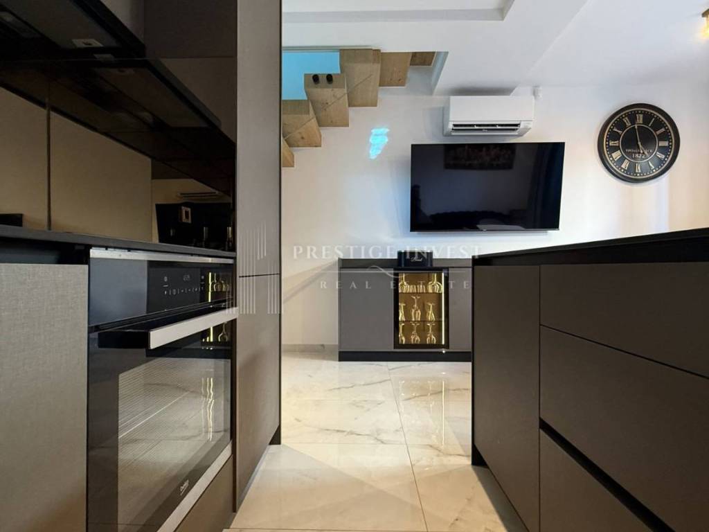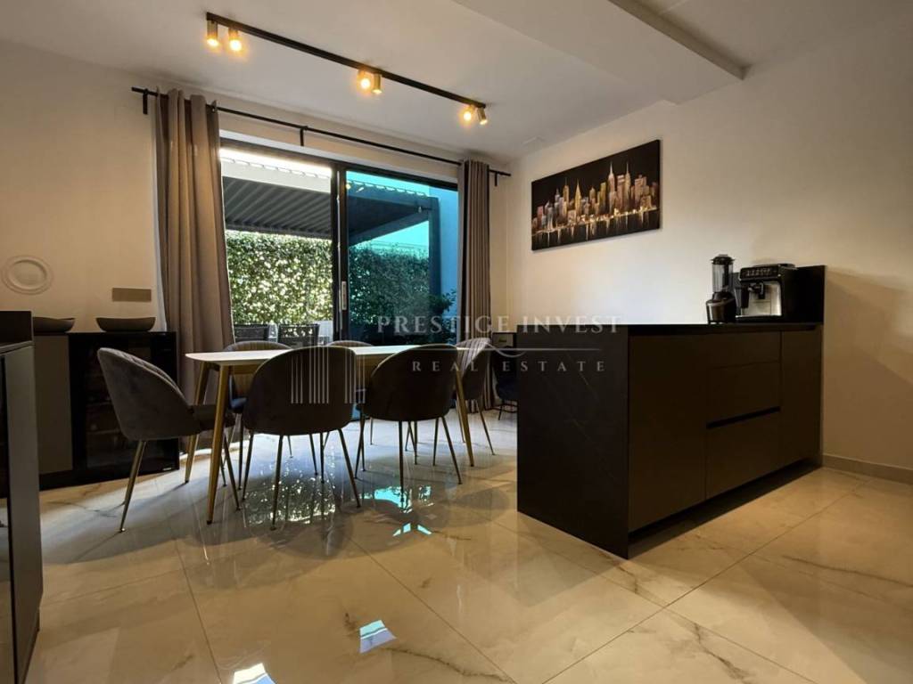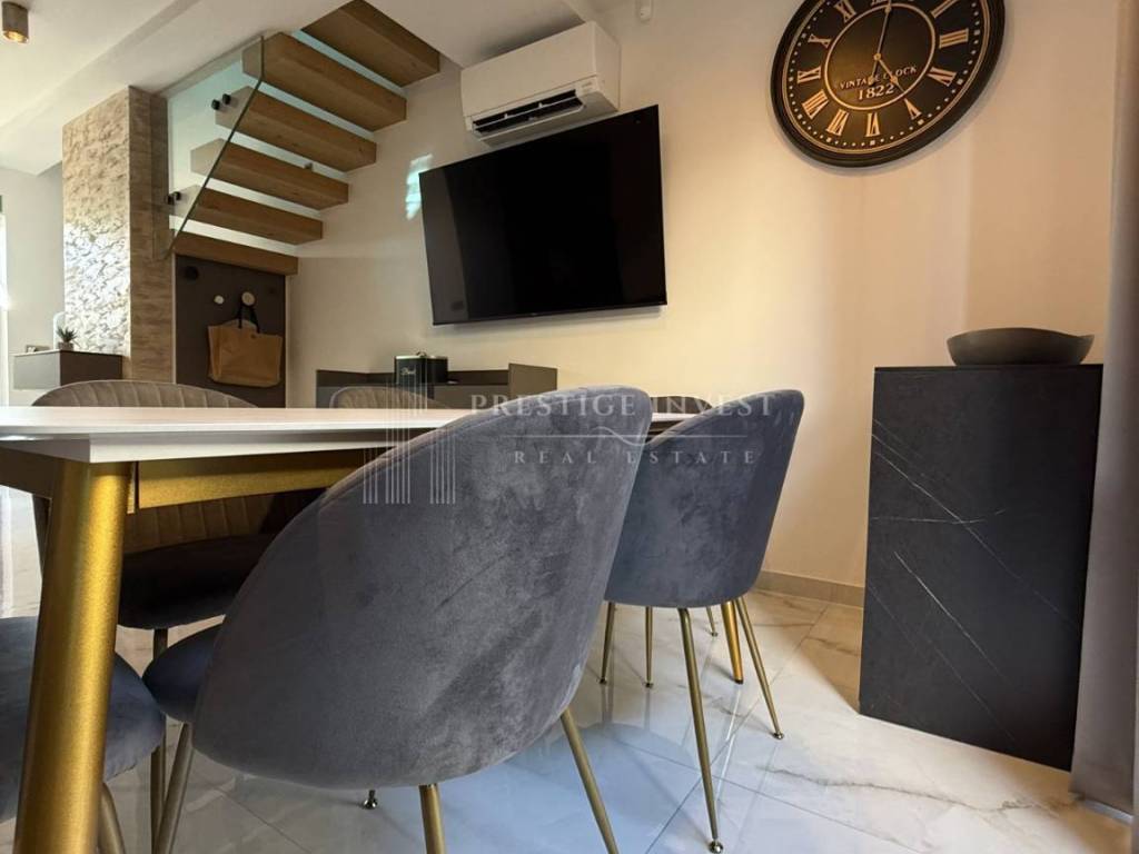 Višeetažni stan se sastoji od ulaza, kupaonice, kuhinje, blagovaone i dnevnog boravka u prizemlju iz kojeg se izlazi na vanjsku terasu.