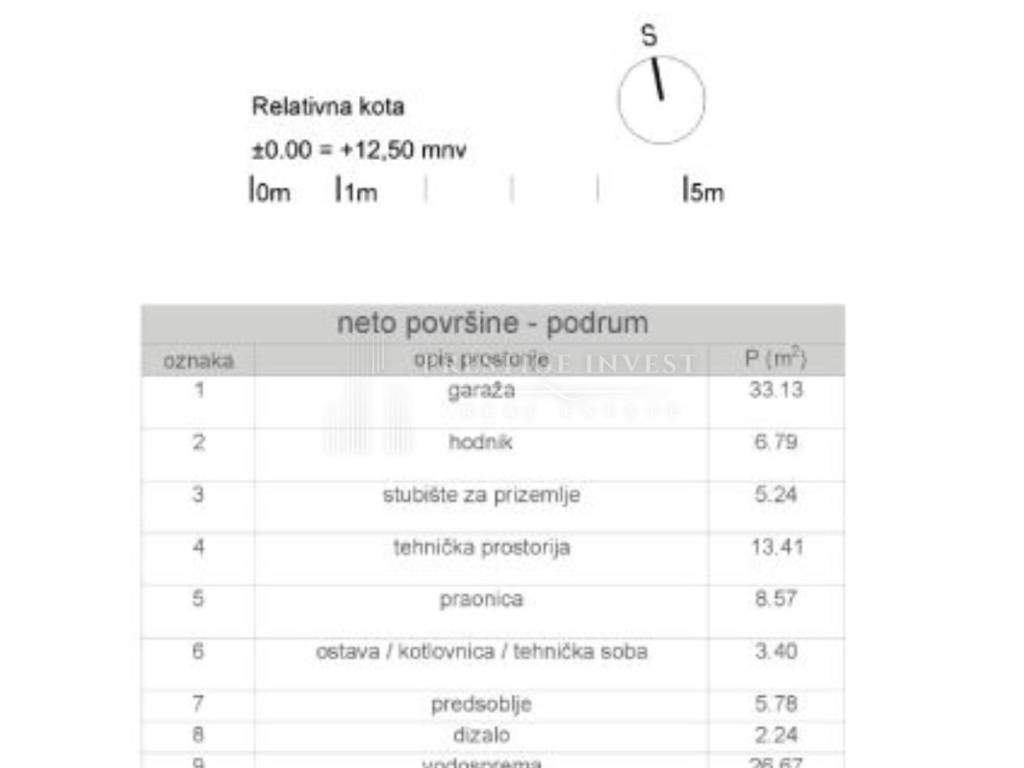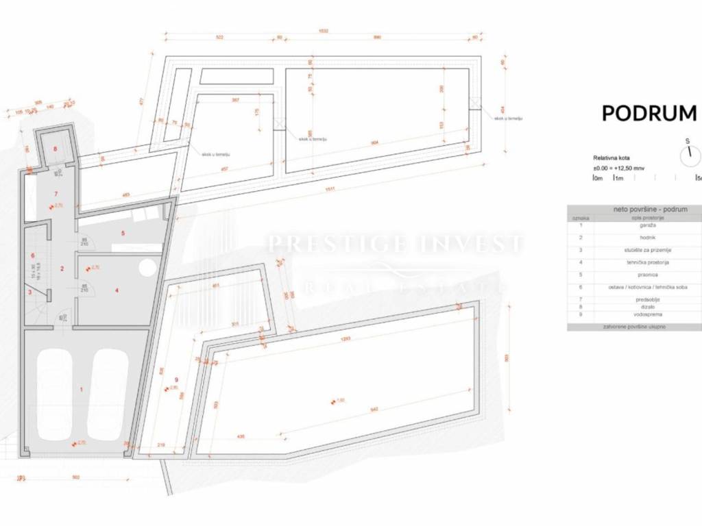 Podrum: garažni prostor, hodnik, tehnička prostorija, praonica, predsoblje, stubište i dizalo