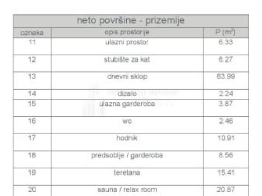 Prizemlje: ulazni prostor, WC, kuhinja s blagovaonicom, dnevni boravak,galerija/ hodnik, stubište i DIZALO, privatna teretana i sauna/relax zona, natkriveni i nenatkriveni vanjski prostori s bazenom