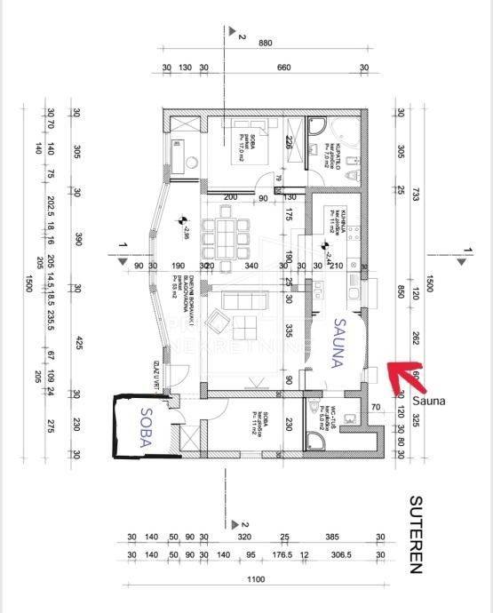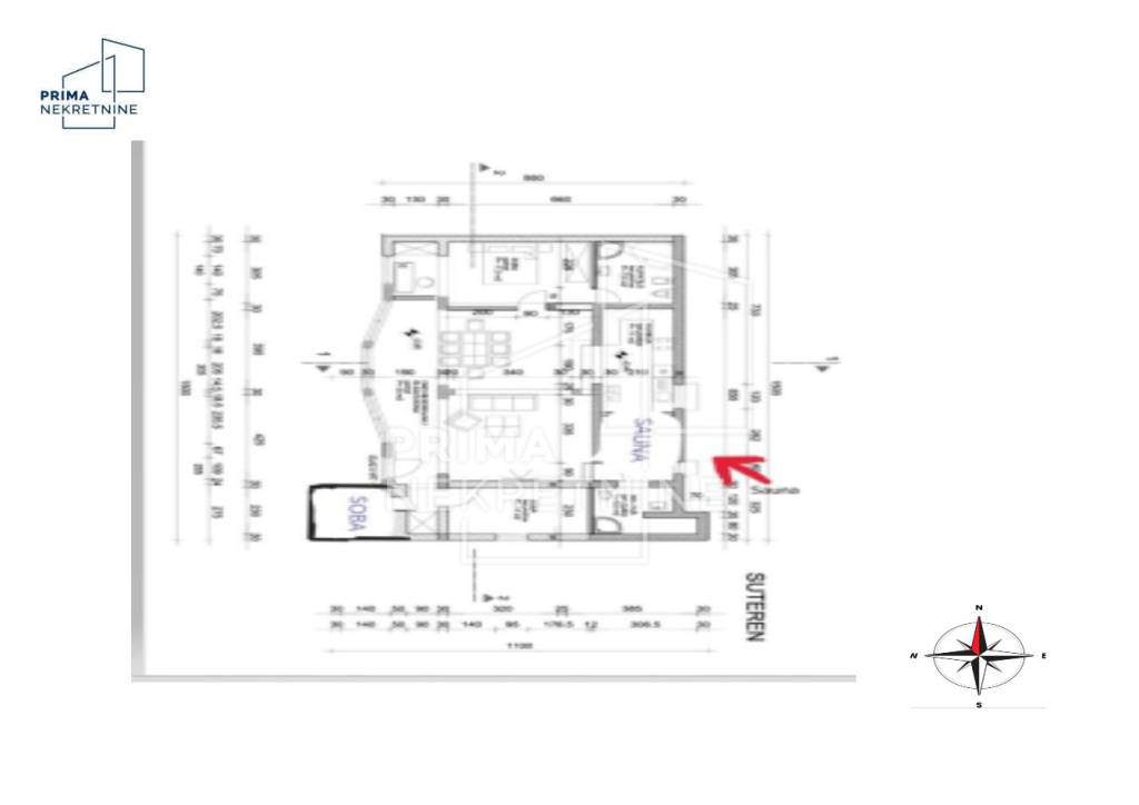 Sastoji se od: - dnevnog boravaka koji je direktno povezan s kuhinjom te s izlazom na prostran vrt - prostrane kuhinje - tri spavaće sobe - dvije kupaonice - saune - ulaznog hodnika