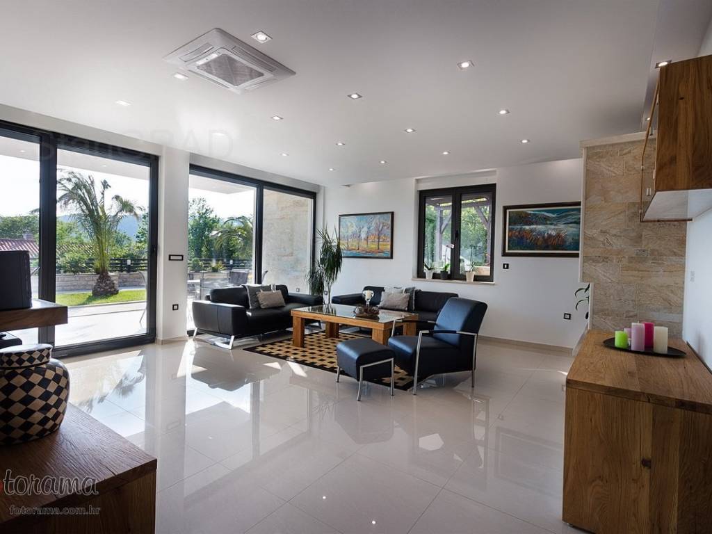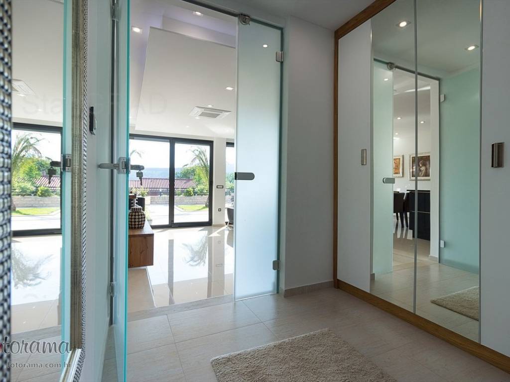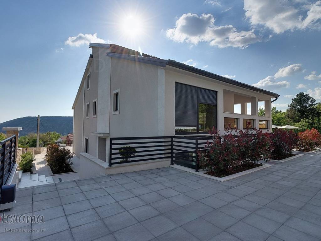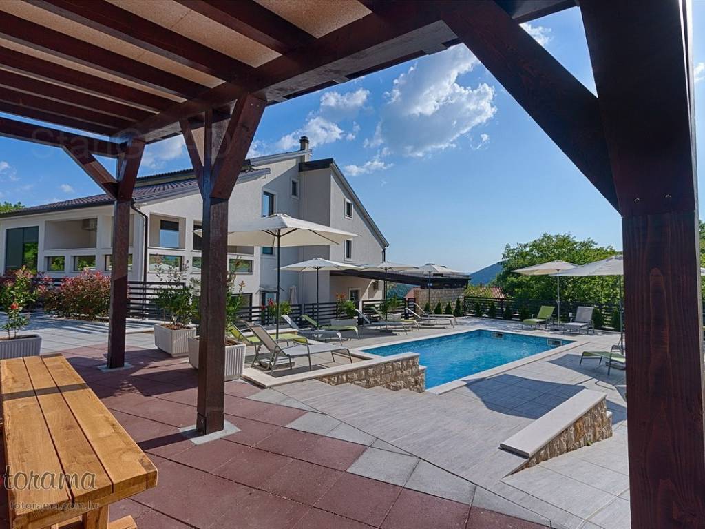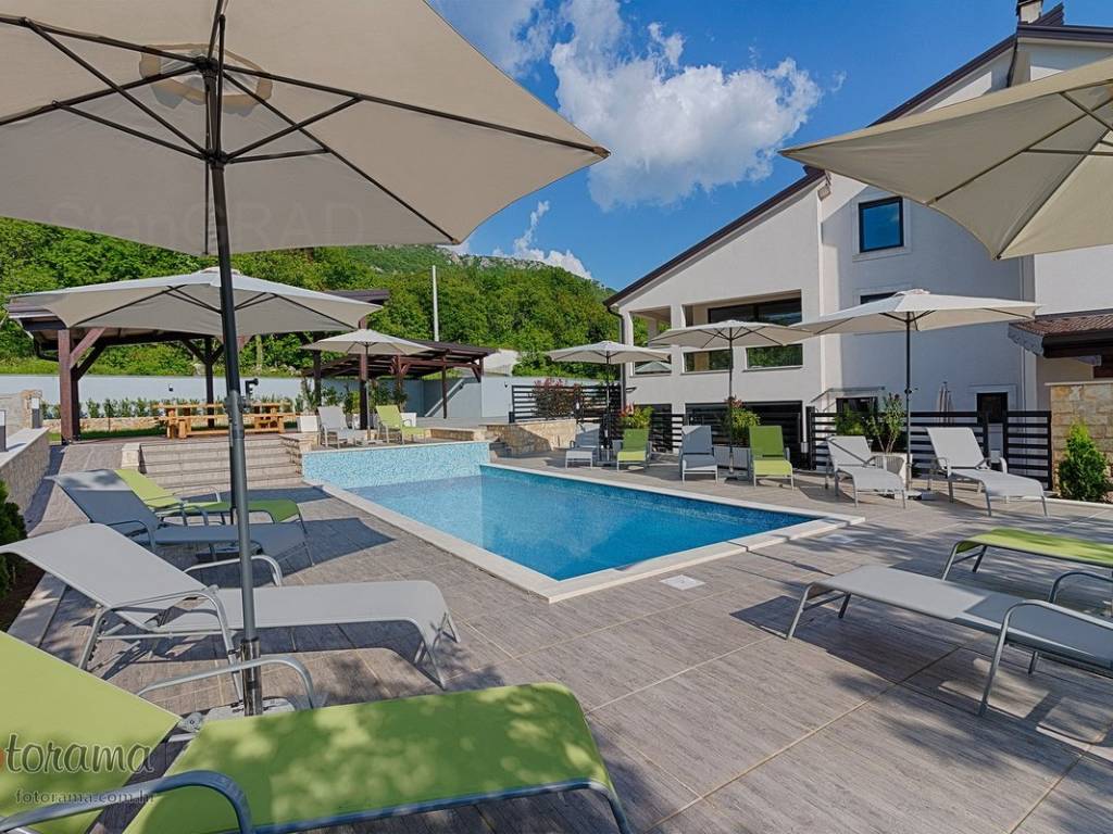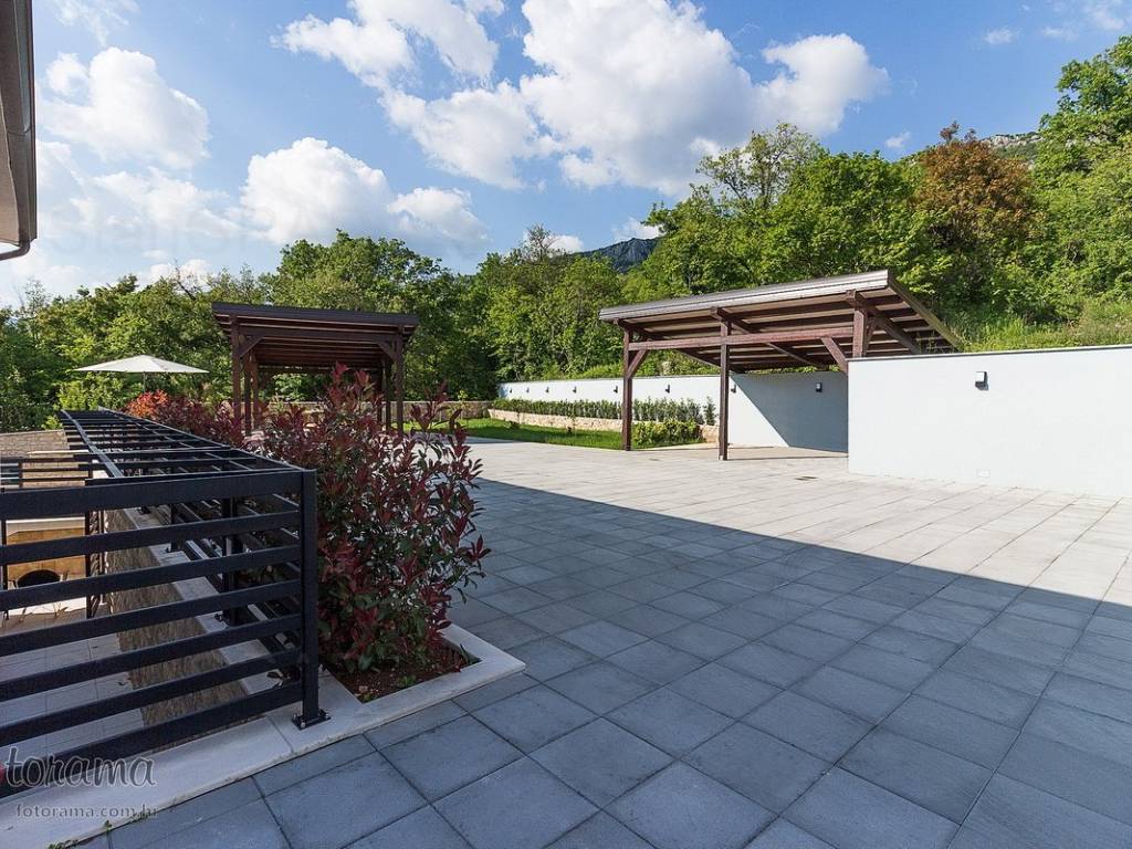 Villa s 2 bazena - zaleđe Crikvenice - prodaja. U ponudi agencije Stan Grad Immobilien nalazi se ova rijetko viđena nekretnina sagrađena u mirnom predjelu, okružena zelenilom i šumom. Ova nenadmašna vila smjestila se u tihom zaleđu Crikvenice i svojom ljepotom i funkcionalnošću privući će one željne potpunog mira i vrhunskog luksuza. Izgrađena je s pomno odabranim najkvalitetnijim materijalima a sve skupa ukomponirano je u skladnu arhitektonsku cjelinu. Približna netto površina ville je 340 m2. Čine je ogromni dnevni boravak s kuhinjom i blagovaonicom, pet spavaćih soba, više manjih ili većih kupaonica kao i nekoliko natkrivenih i nenatkrivenih terasa. S gornjih terasa ima čak i pogled na more. Unutrašnjost je ukrašena mnogim ukusno odabranim detaljima, specijalnom rasvjetom, izvanrednim podnim oblogama i sanitarijama. Sav prostor je popunjen također skupocjenim, posebno biranim pokućstvom. Kao posebnost izdvaja se to što villa ima i unutarnji i vanjski, po potrebi grijani bazen. Površina parcele na kojoj je kuća izgrađena je 1.300 m2 a prekrasno uređene i oplemenjene okućnice cca 1.000 m2. Na okućnici je moguće parkiranje većeg broja vozila. Tu su i dvije lijepe nadstrešnice, vrtni roštilj obrađen kamenom, zelenilo s travom i palmama, opločenje od obrađenog bijelog kamena. Sve skupa odiše mirom, ljepotom i luksuzom. Vlasnici imaju urednu vlasničku dokumentaciju a naš posrednički ured će vam ubrzati i olakšati prijenos vlasništva i obaviti sve ostale potrebne administrativne poslove.