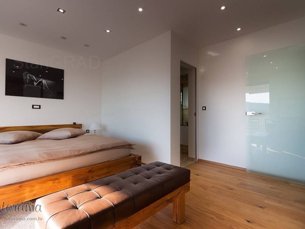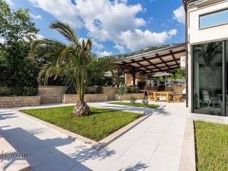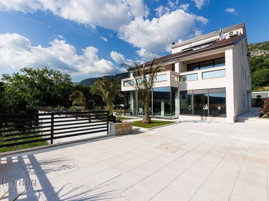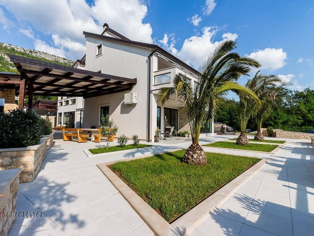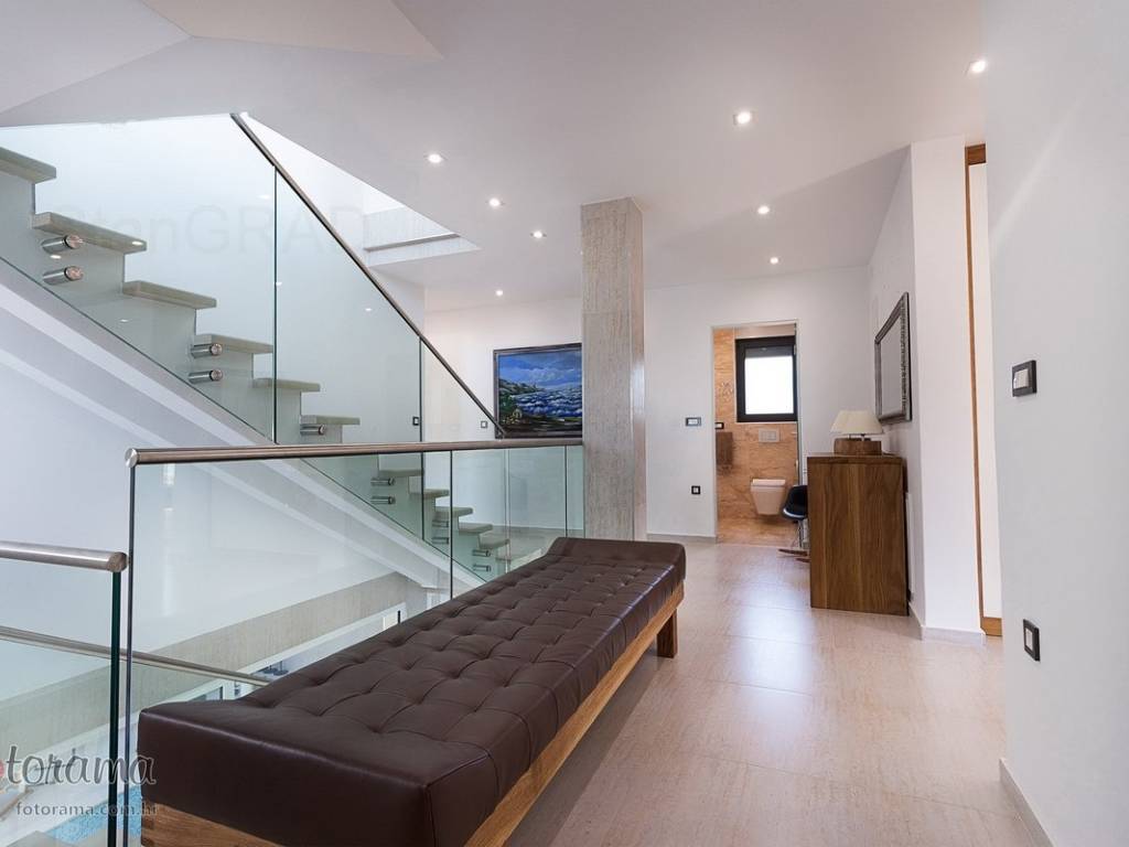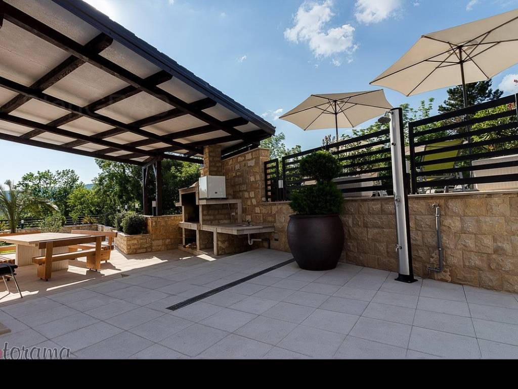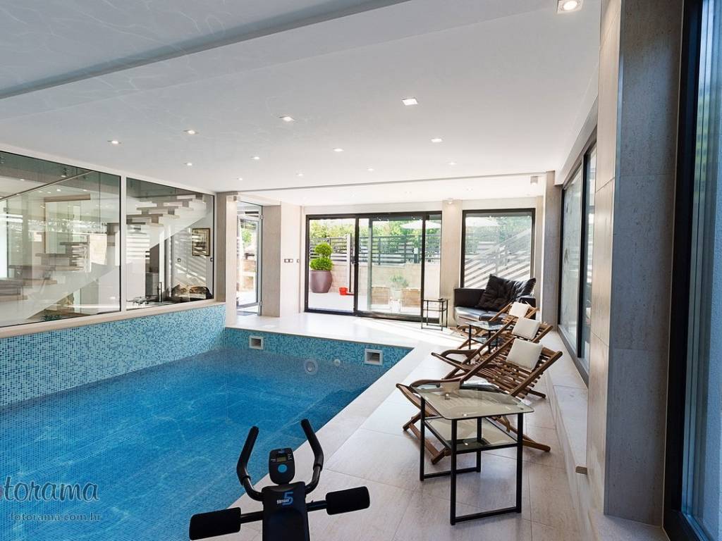 Villa s 2 bazena - zaleđe Crikvenice - prodaja. U ponudi agencije Stan Grad Immobilien nalazi se ova rijetko viđena nekretnina sagrađena u mirnom predjelu, okružena zelenilom i šumom. Ova nenadmašna vila smjestila se u tihom zaleđu Crikvenice i svojom ljepotom i funkcionalnošću privući će one željne potpunog mira i vrhunskog luksuza. Izgrađena je s pomno odabranim najkvalitetnijim materijalima a sve skupa ukomponirano je u skladnu arhitektonsku cjelinu. Približna netto površina ville je 340 m2. Čine je ogromni dnevni boravak s kuhinjom i blagovaonicom, pet spavaćih soba, više manjih ili većih kupaonica kao i nekoliko natkrivenih i nenatkrivenih terasa. S gornjih terasa ima čak i pogled na more. Unutrašnjost je ukrašena mnogim ukusno odabranim detaljima, specijalnom rasvjetom, izvanrednim podnim oblogama i sanitarijama. Sav prostor je popunjen također skupocjenim, posebno biranim pokućstvom. Kao posebnost izdvaja se to što villa ima i unutarnji i vanjski, po potrebi grijani bazen. Površina parcele na kojoj je kuća izgrađena je 1.300 m2 a prekrasno uređene i oplemenjene okućnice cca 1.000 m2. Na okućnici je moguće parkiranje većeg broja vozila. Tu su i dvije lijepe nadstrešnice, vrtni roštilj obrađen kamenom, zelenilo s travom i palmama, opločenje od obrađenog bijelog kamena. Sve skupa odiše mirom, ljepotom i luksuzom. Vlasnici imaju urednu vlasničku dokumentaciju a naš posrednički ured će vam ubrzati i olakšati prijenos vlasništva i obaviti sve ostale potrebne administrativne poslove.