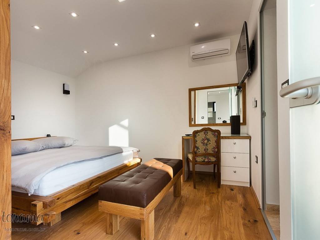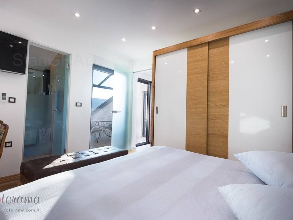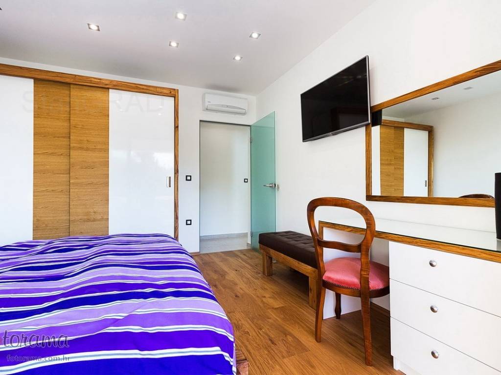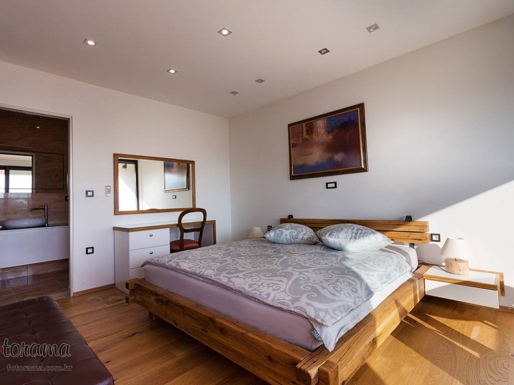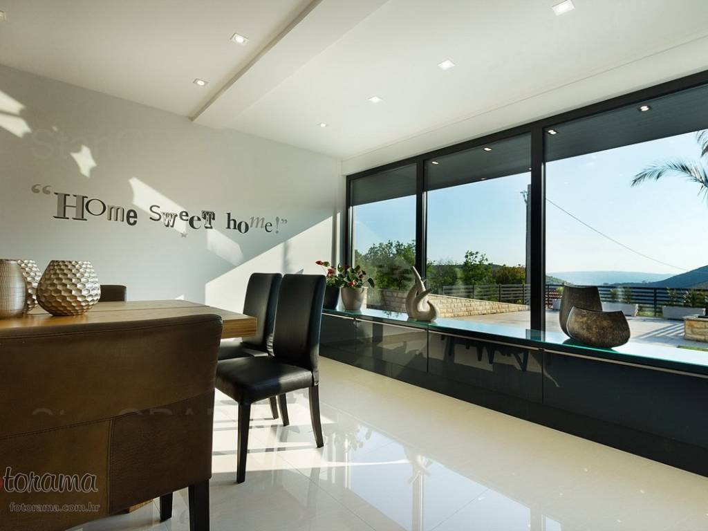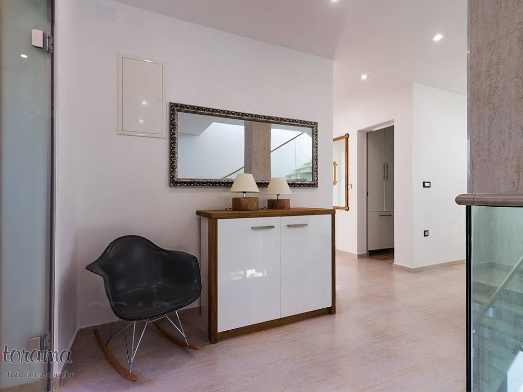 Villa s 2 bazena - zaleđe Crikvenice - prodaja. U ponudi agencije Stan Grad Immobilien nalazi se ova rijetko viđena nekretnina sagrađena u mirnom predjelu, okružena zelenilom i šumom. Ova nenadmašna vila smjestila se u tihom zaleđu Crikvenice i svojom ljepotom i funkcionalnošću privući će one željne potpunog mira i vrhunskog luksuza. Izgrađena je s pomno odabranim najkvalitetnijim materijalima a sve skupa ukomponirano je u skladnu arhitektonsku cjelinu. Približna netto površina ville je 340 m2. Čine je ogromni dnevni boravak s kuhinjom i blagovaonicom, pet spavaćih soba, više manjih ili većih kupaonica kao i nekoliko natkrivenih i nenatkrivenih terasa. S gornjih terasa ima čak i pogled na more. Unutrašnjost je ukrašena mnogim ukusno odabranim detaljima, specijalnom rasvjetom, izvanrednim podnim oblogama i sanitarijama. Sav prostor je popunjen također skupocjenim, posebno biranim pokućstvom. Kao posebnost izdvaja se to što villa ima i unutarnji i vanjski, po potrebi grijani bazen. Površina parcele na kojoj je kuća izgrađena je 1.300 m2 a prekrasno uređene i oplemenjene okućnice cca 1.000 m2. Na okućnici je moguće parkiranje većeg broja vozila. Tu su i dvije lijepe nadstrešnice, vrtni roštilj obrađen kamenom, zelenilo s travom i palmama, opločenje od obrađenog bijelog kamena. Sve skupa odiše mirom, ljepotom i luksuzom. Vlasnici imaju urednu vlasničku dokumentaciju a naš posrednički ured će vam ubrzati i olakšati prijenos vlasništva i obaviti sve ostale potrebne administrativne poslove.