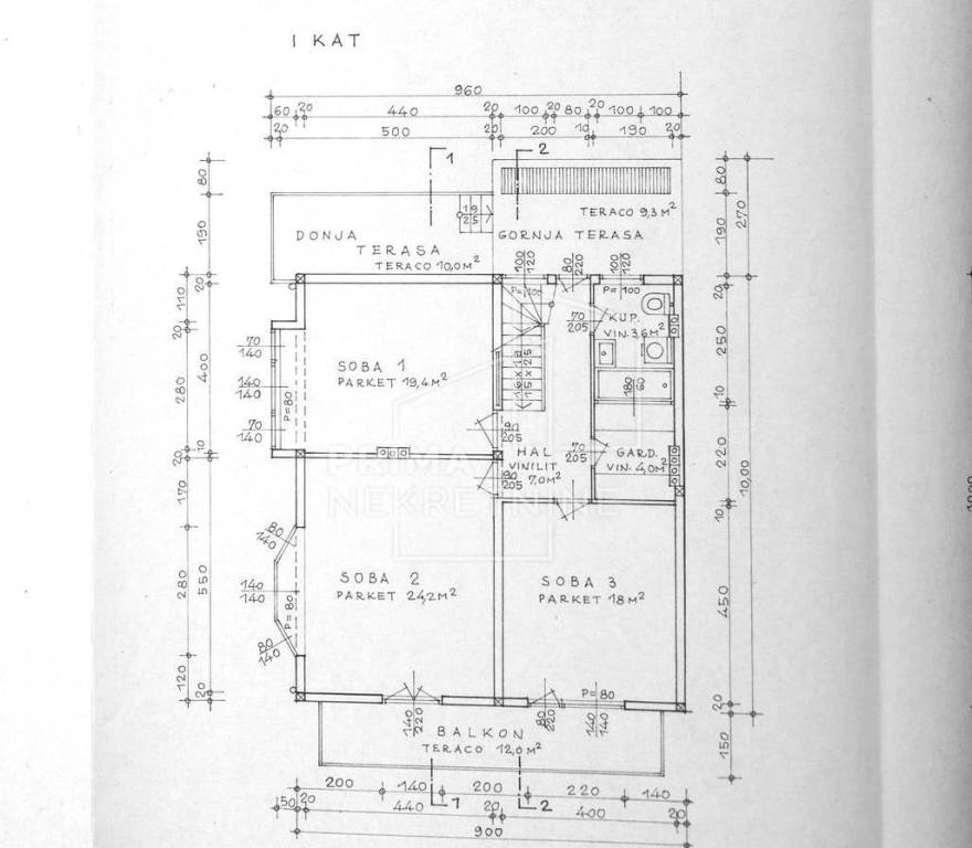 Potkrovlje: kuhinja s blagovaonicom, dvije sobe, kupaonica i balkon.