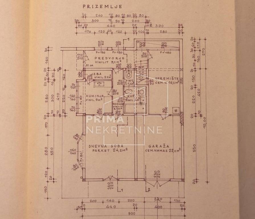 Prizemlje: dnevni boravak s blagovaonicom i kuhinjom, kupaonica, spremište, ulazni hodnik i garaža.