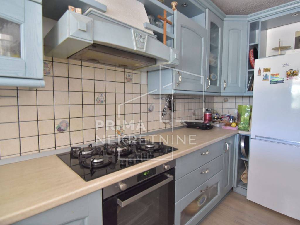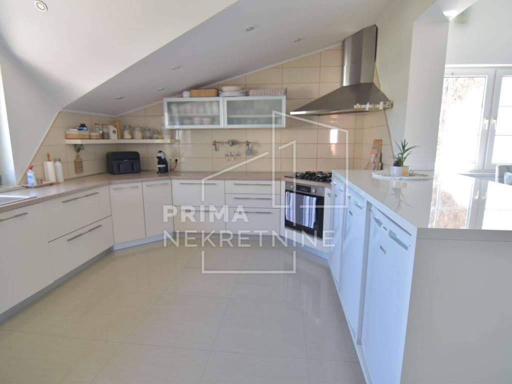 Interijer kuće moderno je uređen s naglaskom na funkcionalnost, prirodnu svjetlost i svijetle tonove. Kuhinja u nježnoj plavoj boji ima obilje radnih površina i ističe se kao središnji prostor. Etaže su povezane unutarnjim stepeništem, a kroz kuću vode dva praktično raspoređena hodnika. Kupaonice su suvremeno uređene s kvalitetnim sanitarijama, spavaće sobe opremljene ugradbenim ormarima i TV-ima, dok je dječja soba razigranog dizajna. Cjelokupan prostor odlikuje se skladnim dizajnom i profinjenim dekorativnim detaljima.