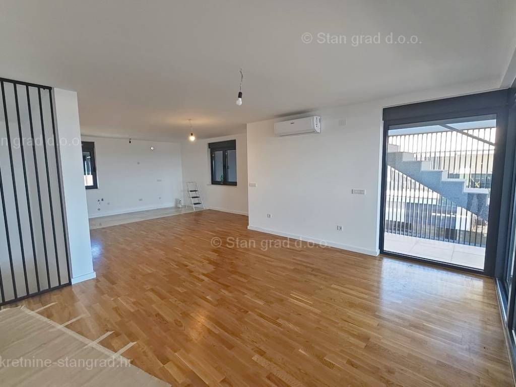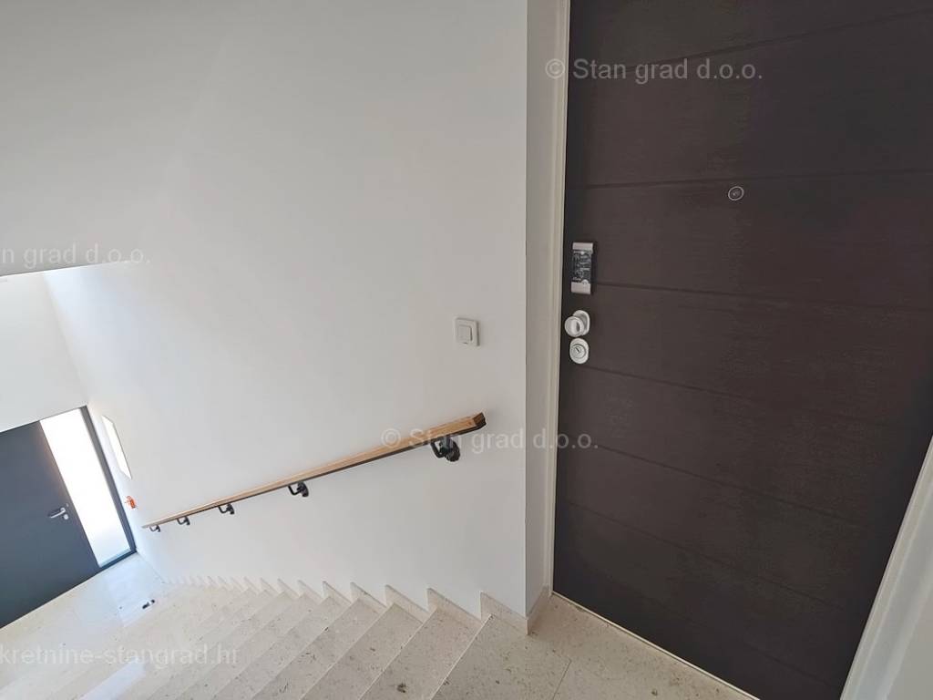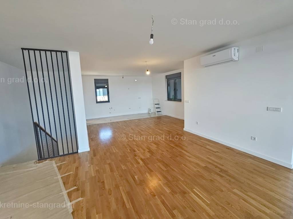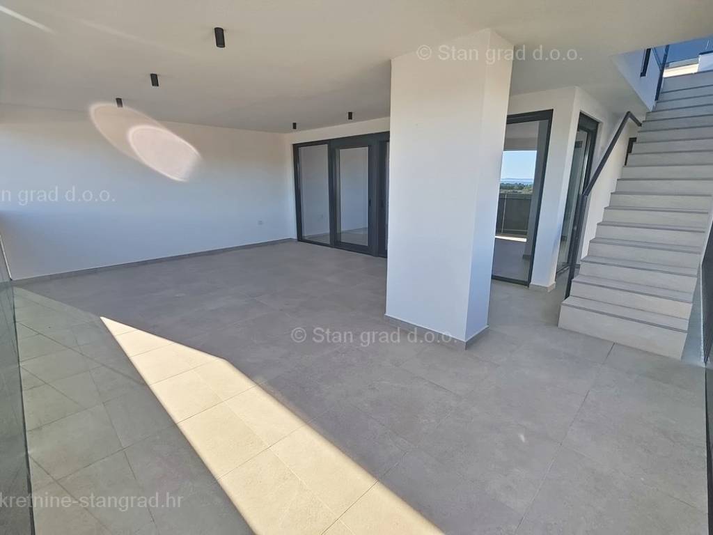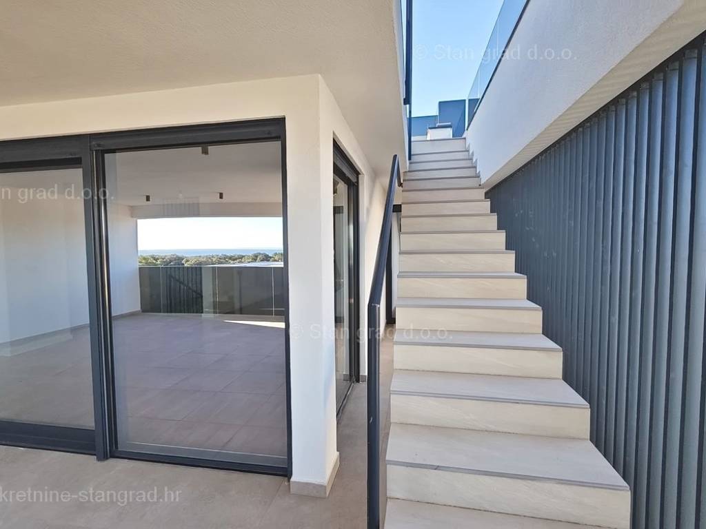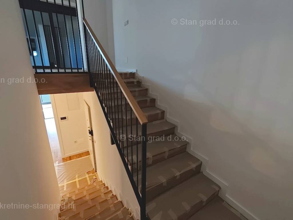 Unutar luksuzno izgrađenog objekta, stan se nalazi na etaži 1 i 2. Ukupna površina dvoetažnog apartmana iznosi 167 m2. Na 1. katu apartmana se nalazi ulazni hodnik, tri spavaće sobe, 2 kupaonice, natkrivena terasa i balkon. Unutarnjim stepeništem dolazi se na kat gdje se nalazi dnevni boravak, kuhinja s blagovaonicom, wc.