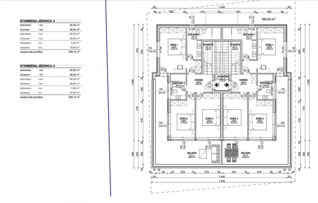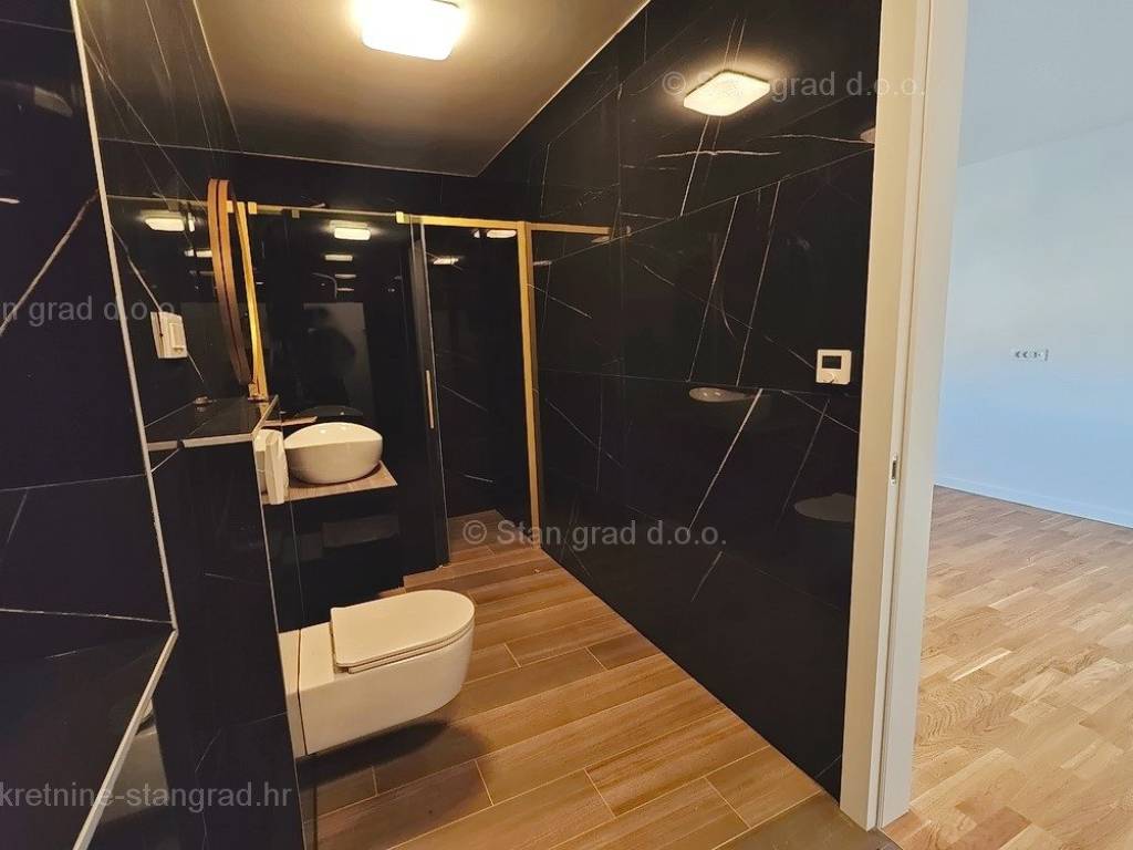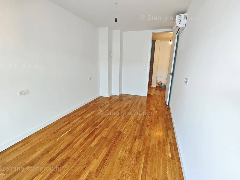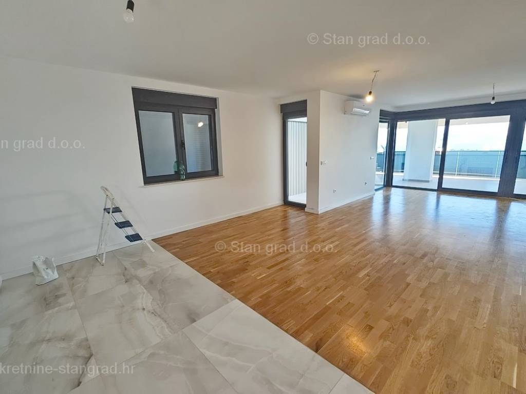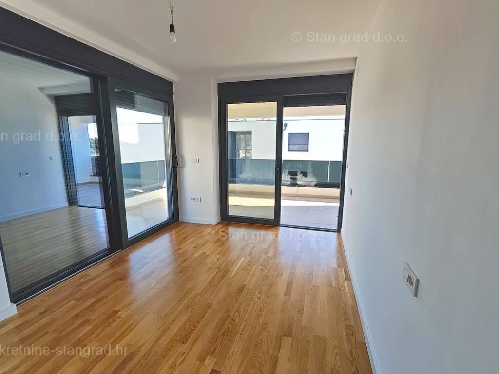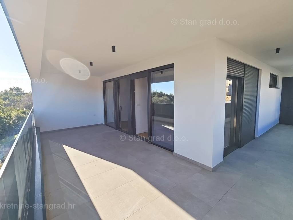 Unutar luksuzno izgrađenog objekta, stan se nalazi na etaži 1 i 2. Ukupna površina dvoetažnog apartmana iznosi 167 m2. Na 1. katu apartmana se nalazi ulazni hodnik, tri spavaće sobe, 2 kupaonice, natkrivena terasa i balkon. Unutarnjim stepeništem dolazi se na kat gdje se nalazi dnevni boravak, kuhinja s blagovaonicom, wc.