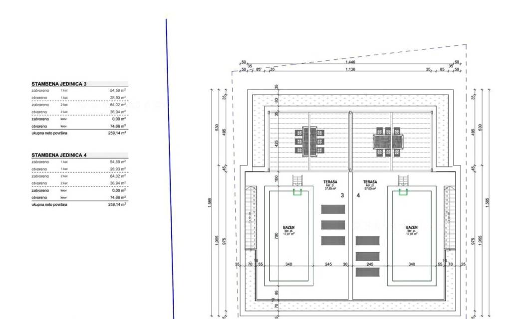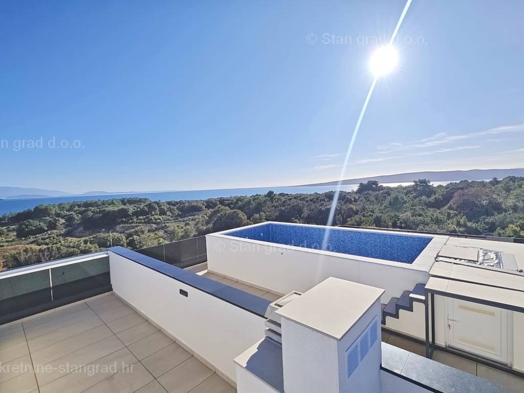 Vanjskim stubištem dolazi se na krovnu terasu koja sadrži bazen i strojarnicu. S krovne terase pruža se panoramski pogled na more. Uz apartman, novi vlasnik nekretnine na raspolaganju ima dva parkirna mjesta. Uzimajući u obzir sve prohodne unutarnje i vanjske površine, uključujući terase i parkirna mjesta, apartman raspolaže stvarnom bruto iskoristivom površinom od 270 m2.