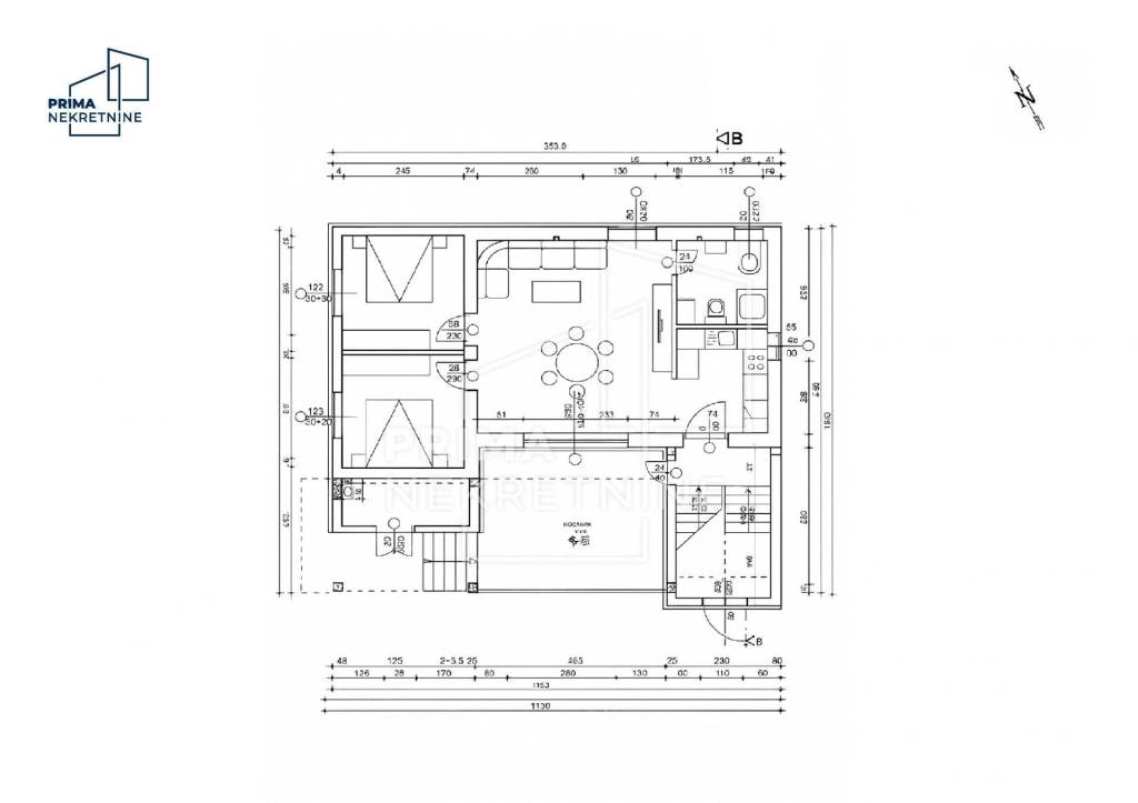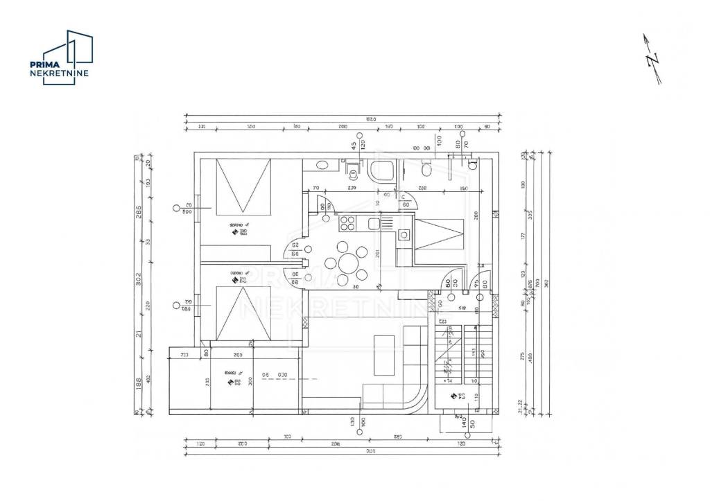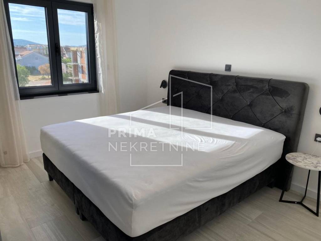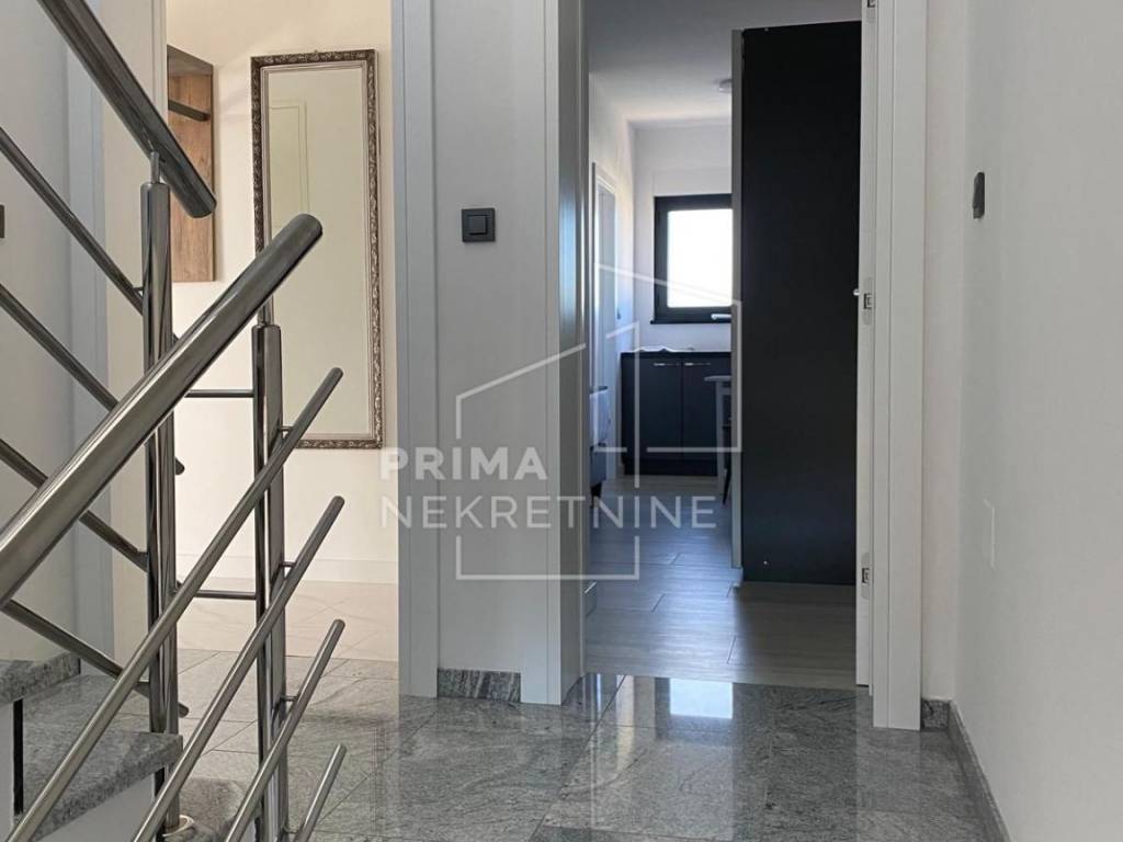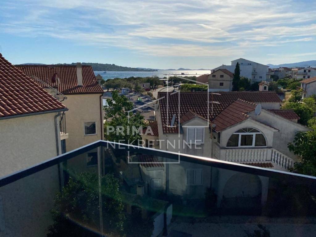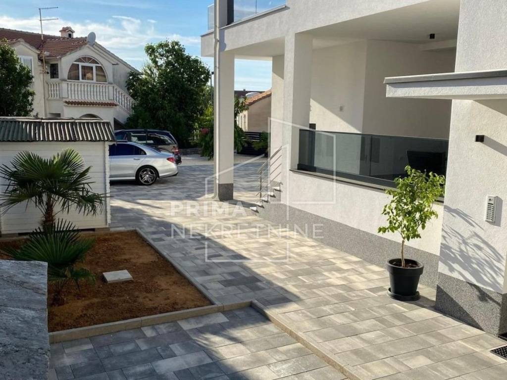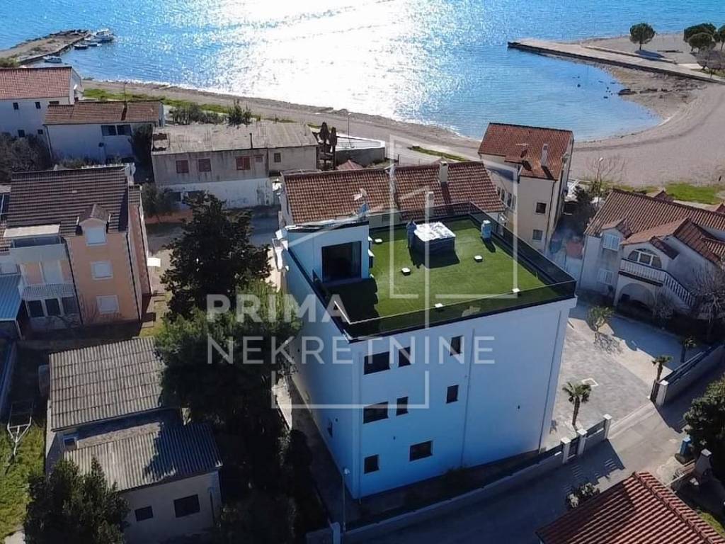 U ponudi je moderno uređena apartmanska kuća na atraktivnoj lokaciji u Srimi kraj Vodica, udaljena svega pedesetak metara od plaže. Parcela ima ukupnu površinu od 489 m2, od čega je 141 m2 uređena okućnica s dvorištem, roštiljem, spremištem i osiguranim parkirnim mjestima za do osam vozila.