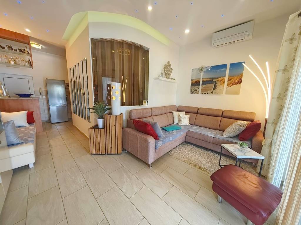 Posebnu vrijednost nekretnini daje i pripadajući dio dvorišta s malim vrtom površine 3 četvorna metra, idealnim za opuštanje ili uređenje po želji. Uz apartman dolazi i vlastito parkirno mjesto, što je iznimno korisno s obzirom na lokaciju u centru mjesta. Apartman je izvrsno orijentiran, pa se iz njega pruža prekrasan pogled na more i obalni krajolik.