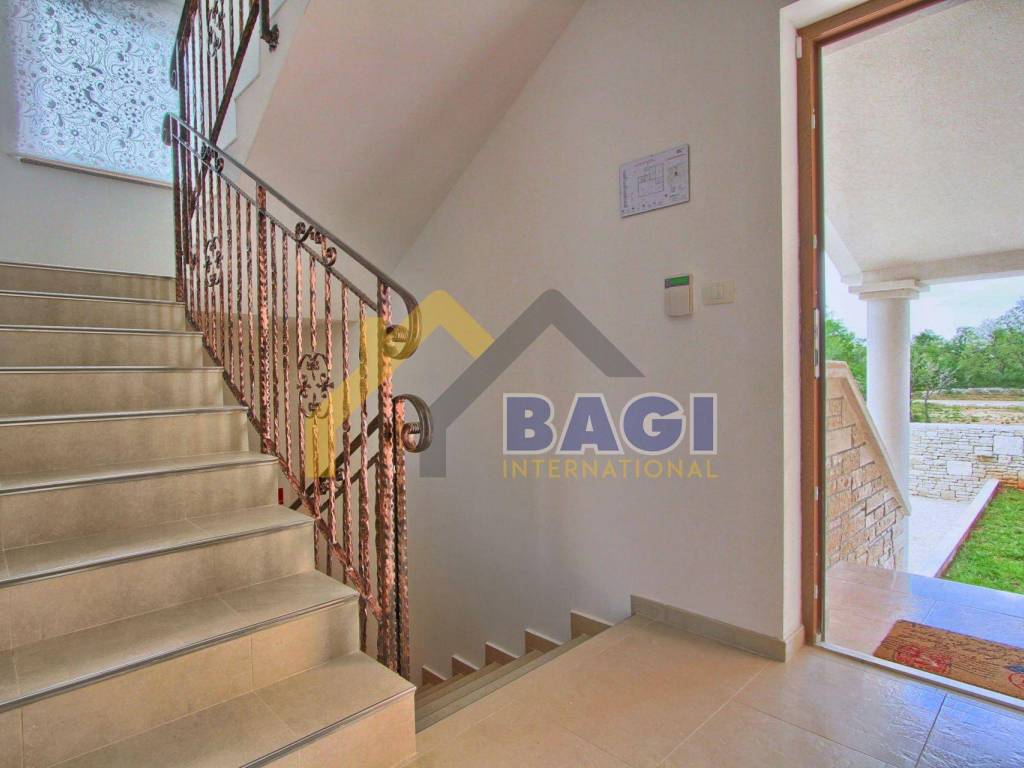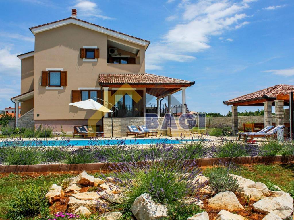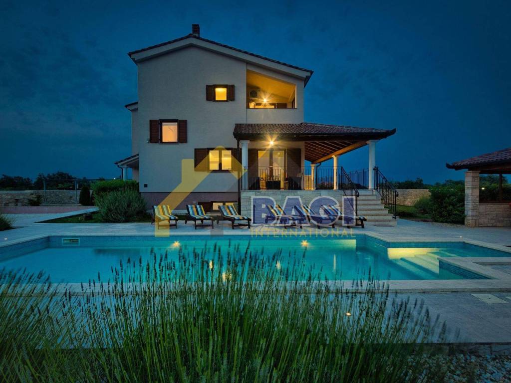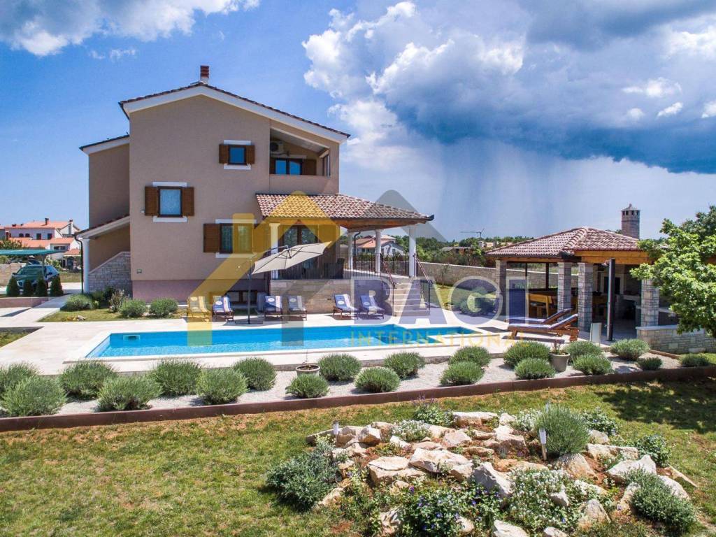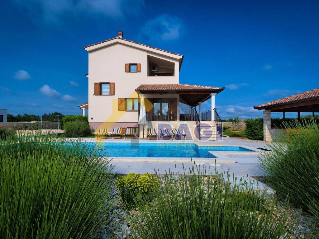 Ova predivna villa sa bazenom smjestila se u malom selu Štokovci. S obzirom da se radi o Istarskom selu sama villa je građena u Istarskom duhu. Kada dolazimo do same vile prvo šta se može primjetiti je kvalitetno zidani suhozid visine 1,5 metra, suhozid daje pravi Istarski ugođaj ovoj villi. na ulazu se nalaze 3 natkrivena parkirna mjesta te sa lijeve strane možemo primjetiti red maslina i travnjak.