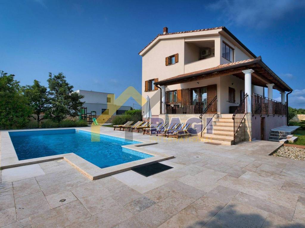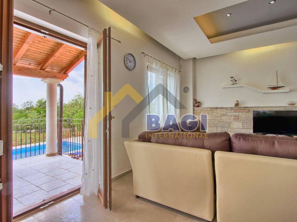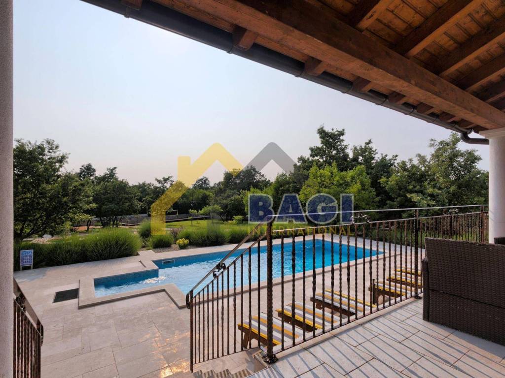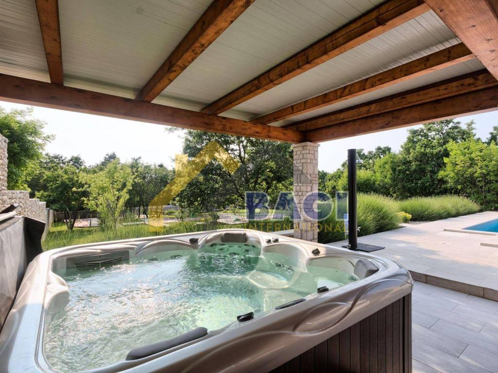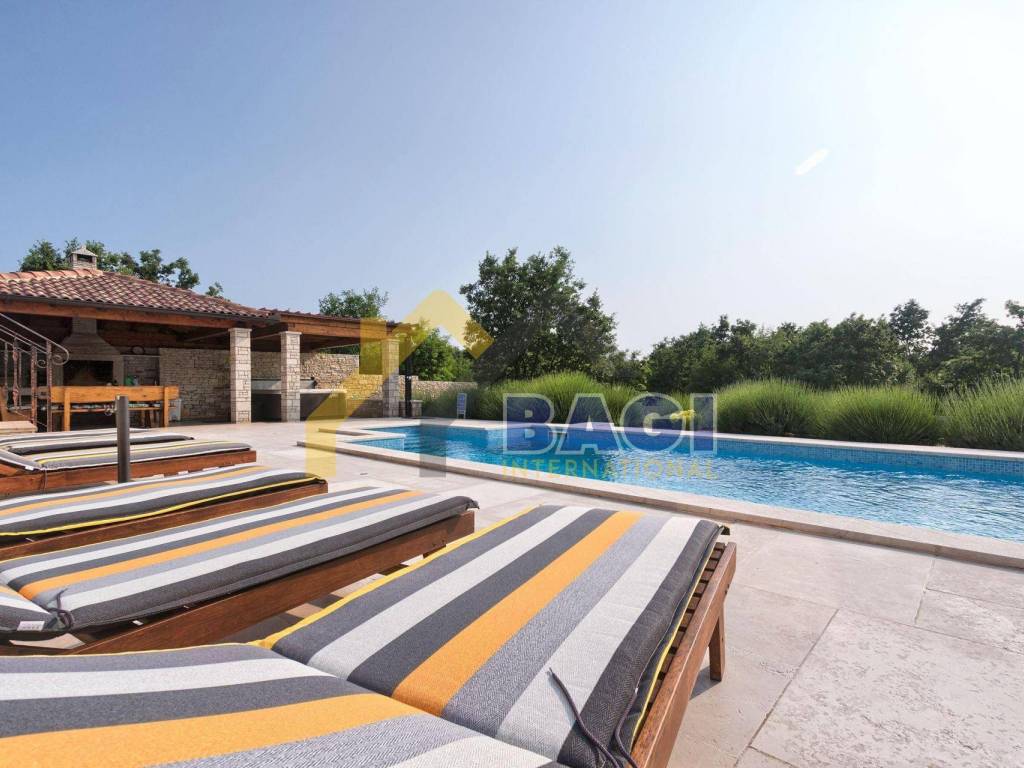Ova predivna villa sa bazenom smjestila se u malom selu Štokovci. S obzirom da se radi o Istarskom selu sama villa je građena u Istarskom duhu. Kada dolazimo do same vile prvo šta se može primjetiti je kvalitetno zidani suhozid visine 1,5 metra, suhozid daje pravi Istarski ugođaj ovoj villi. na ulazu se nalaze 3 natkrivena parkirna mjesta te sa lijeve strane možemo primjetiti red maslina i travnjak.