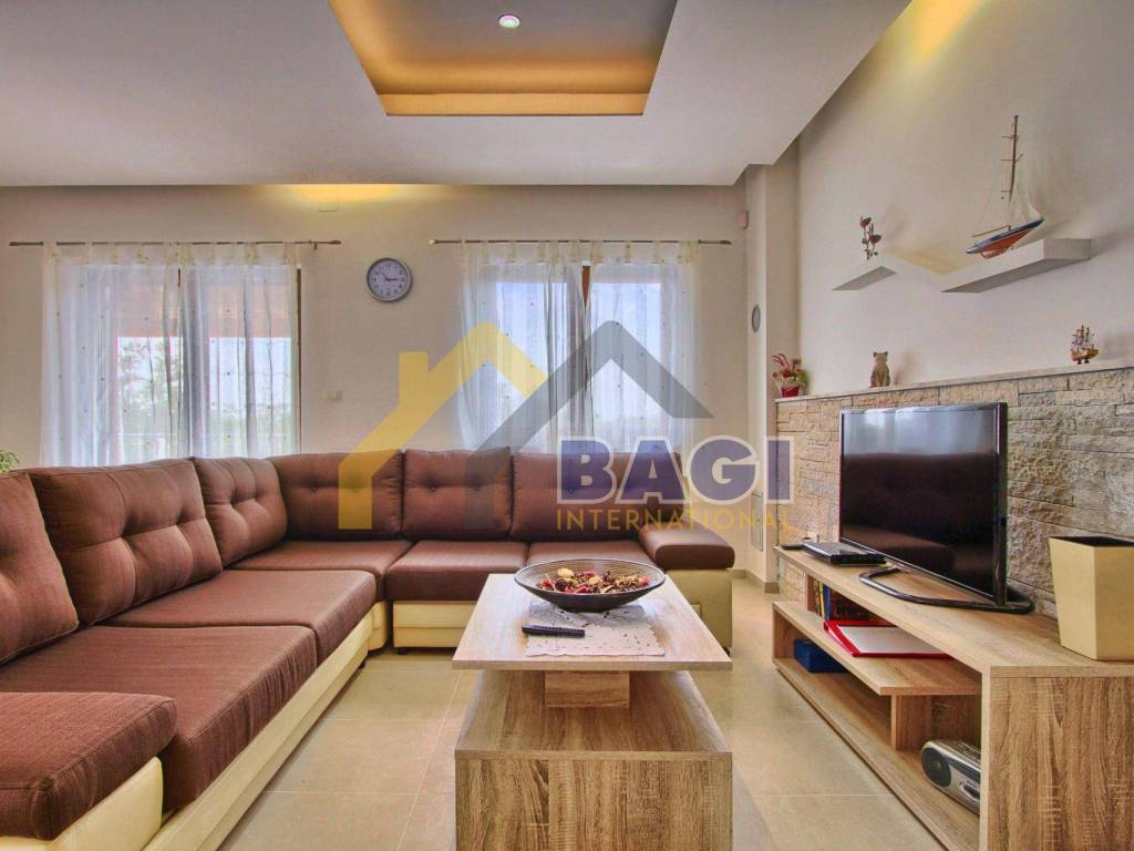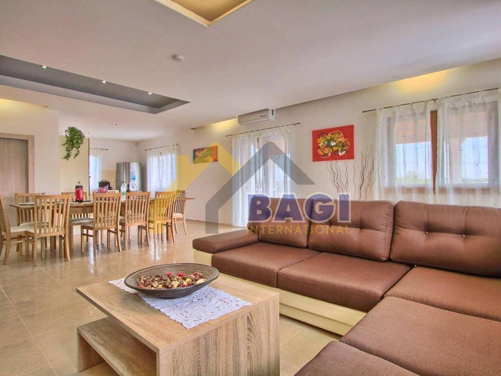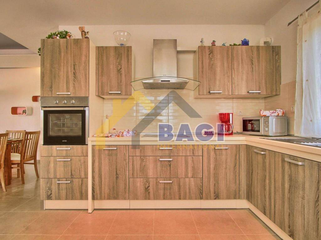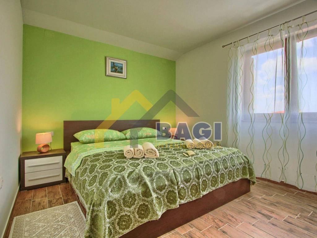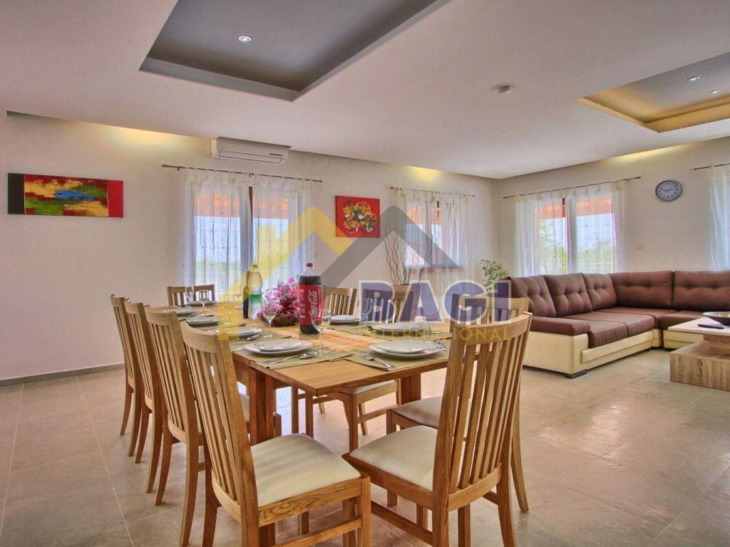 Na ulazu u kuću (u prizemlju) dolazimo do predsoblja sa kupatilom koje nas vodi do prostranog dnevnog boravka sa kuhinjom i blagovaonicom koji ima izlaz na veliku natkrivenu terasu (37 m2) sa koje imamo pogled na bazen i kamin. U prizemlju se također nalazi i soba sa bračnim krevetom te pomoćnim krevetom za jednu osobu i kupatilom.