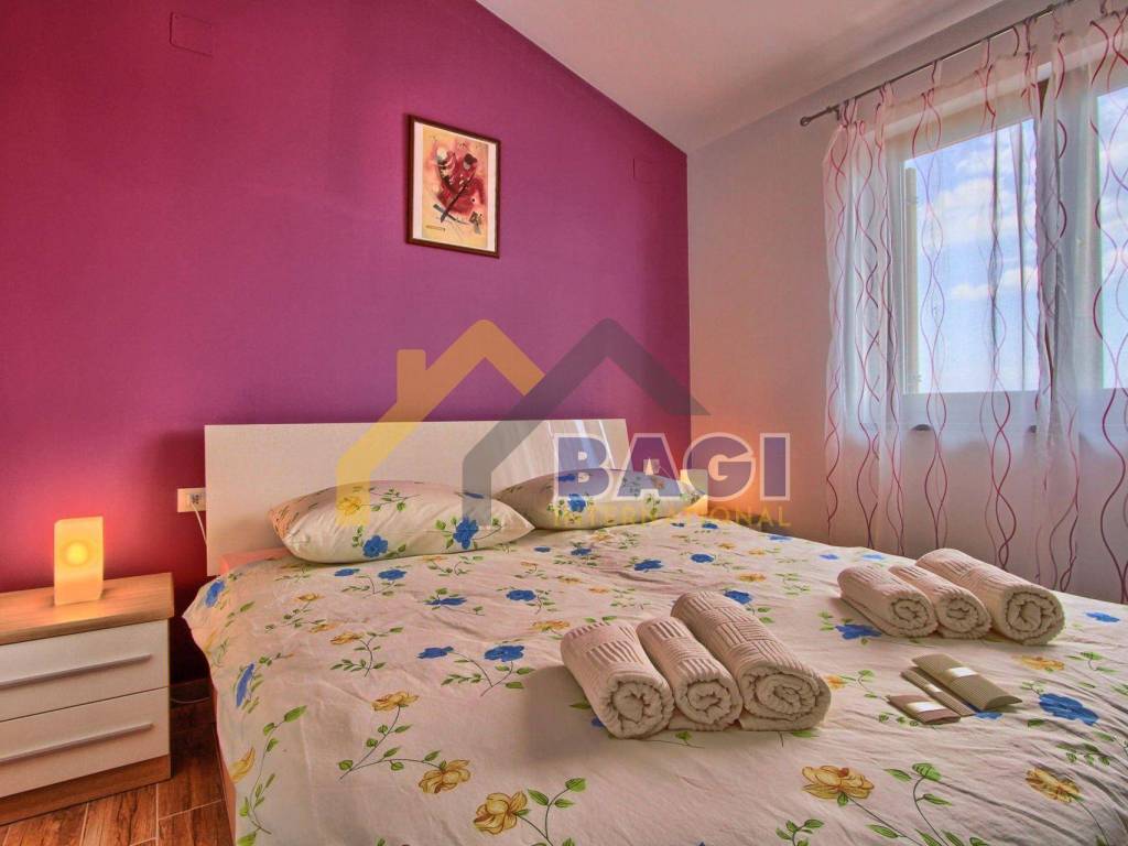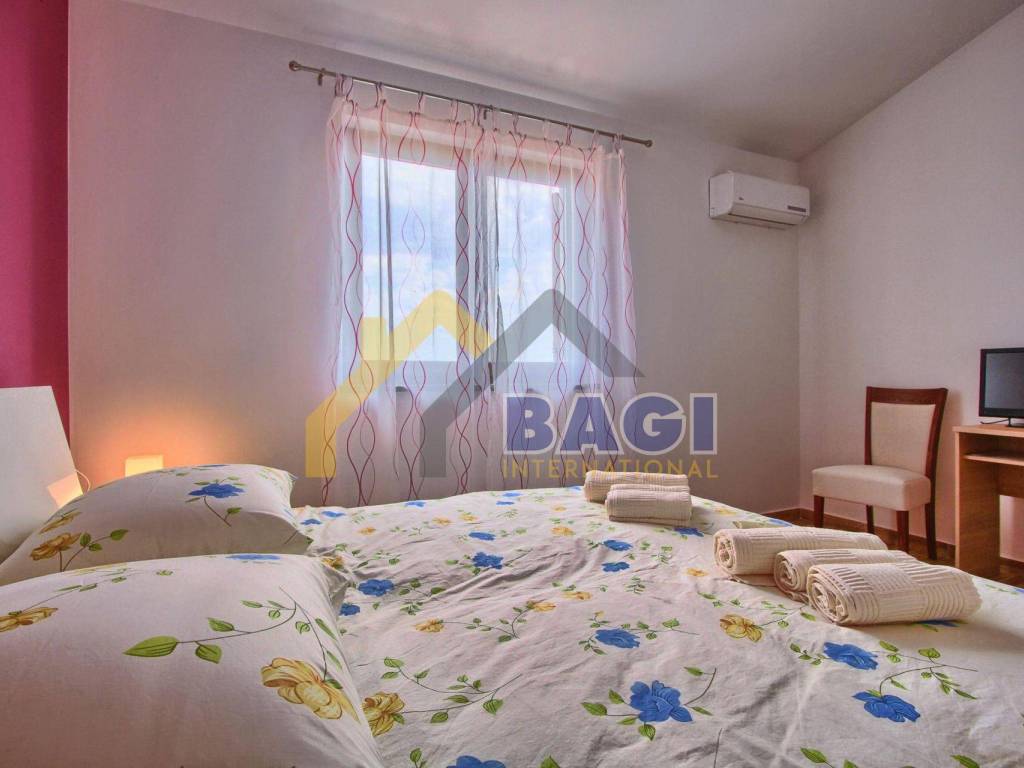stepenicama koje nas vode na kat dolazimo do predsoblja te imamo tri ulaza za tri prostrane spavaće sobe sa vlastitim kupatilom, klima uređajem, televizorom te jedna od njih ima izlaz na predivnu terasu sa pogledom na more.