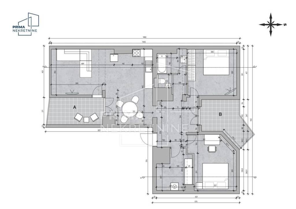 Sastoji se od dvije spavaće sobe i dnevnog boravka spojenog s kuhinjom, dvije terase ukupno 17m2, prostranog spremišta i velikog hodnika, te spremišta u prizemlju zgrade.