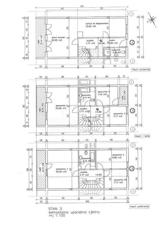 Druga etaža ukupne površine 56m2 je visoko potkrovlje,a sastoji se od tri spavaće sobe, kupaonice, dvije lođe, stepenica.
