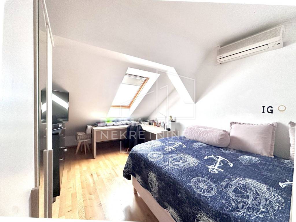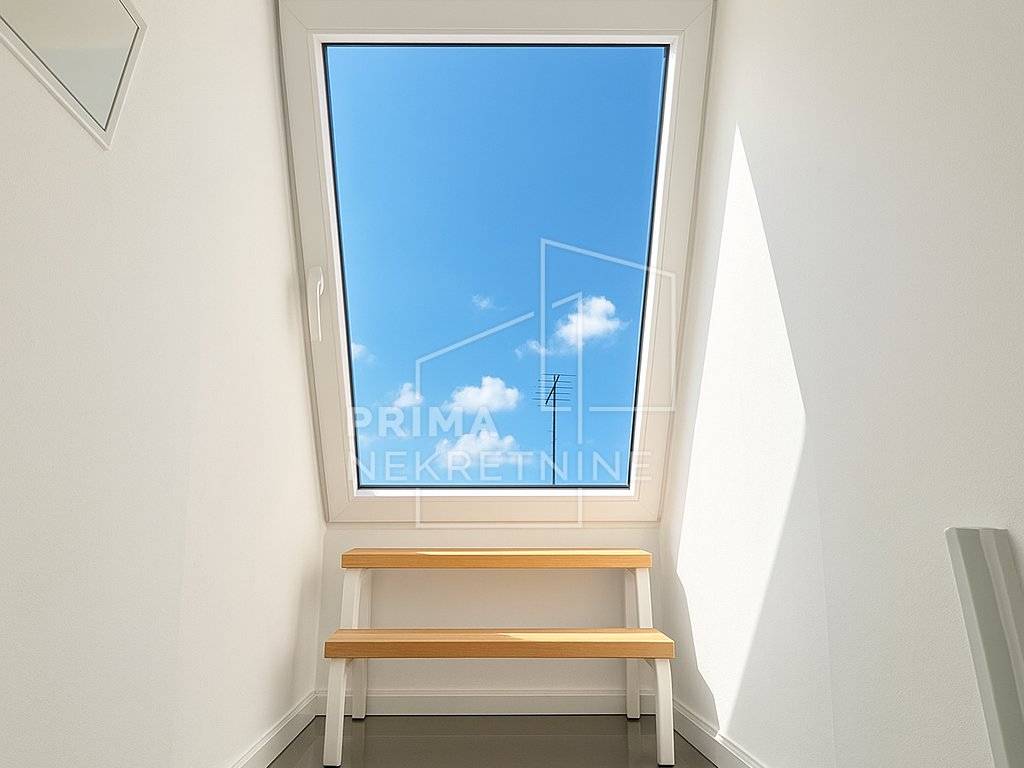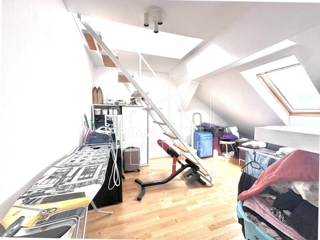 Stan se sastoji od tri spavaće sobe, dnevnog boravka povezanog s kuhinjom, kupaonice te zasebnog WC-a. Posebnu vrijednost stanu daje izlaz na krovnu terasu/kosi krov površine cca 50 m2, koja pruža dodatni prostor za opuštanje ili druženje na otvorenom.