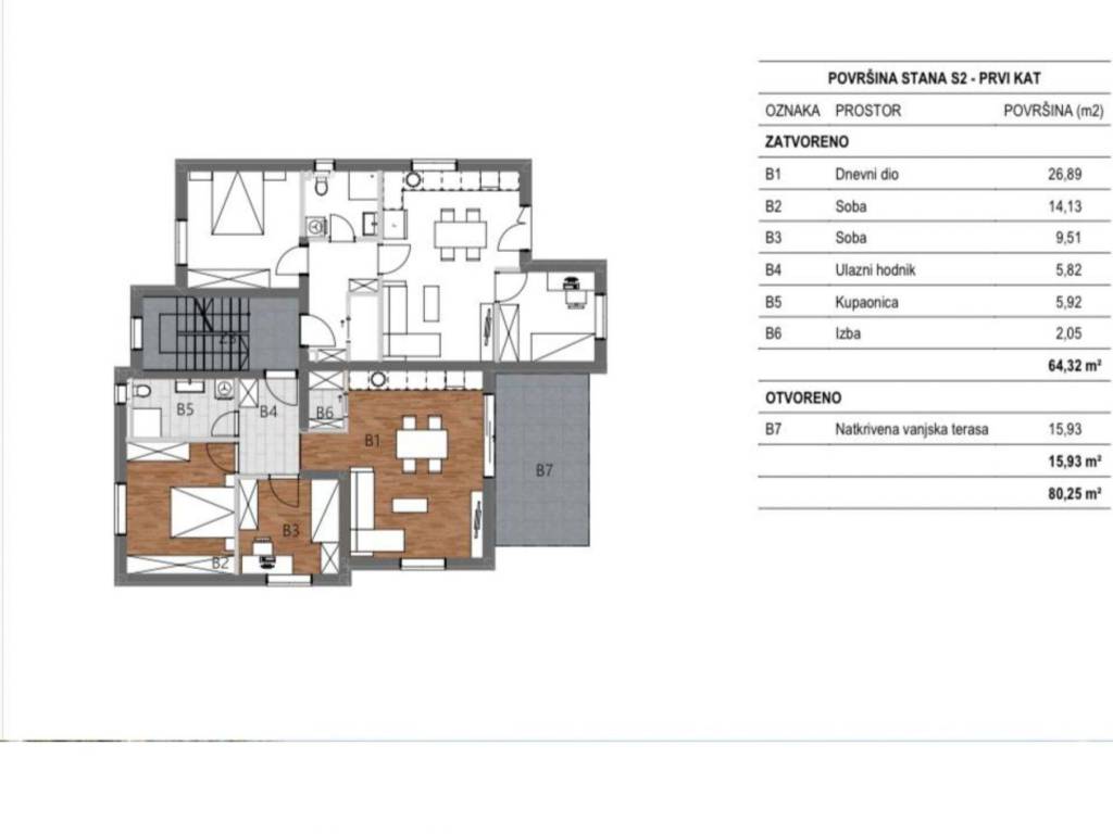 Stan S2 ima obračunsku površinu 72,32 m², dok je neto korisna površina 80,25 m². Prostorno je vrlo funkcionalan, s dobro osmišljenim rasporedom: