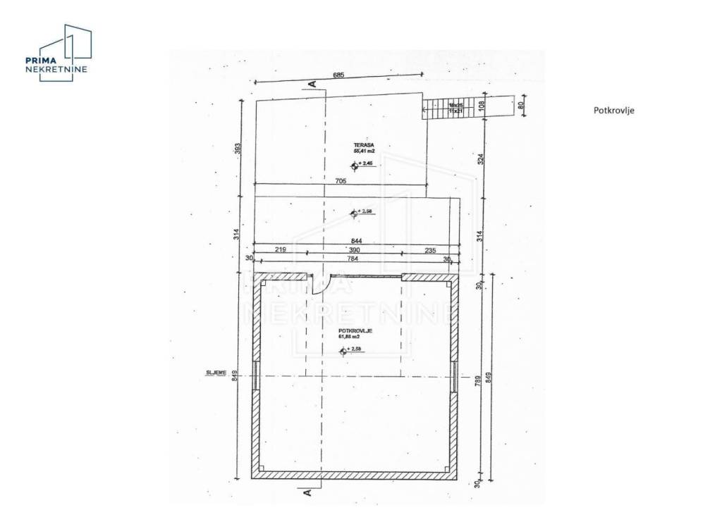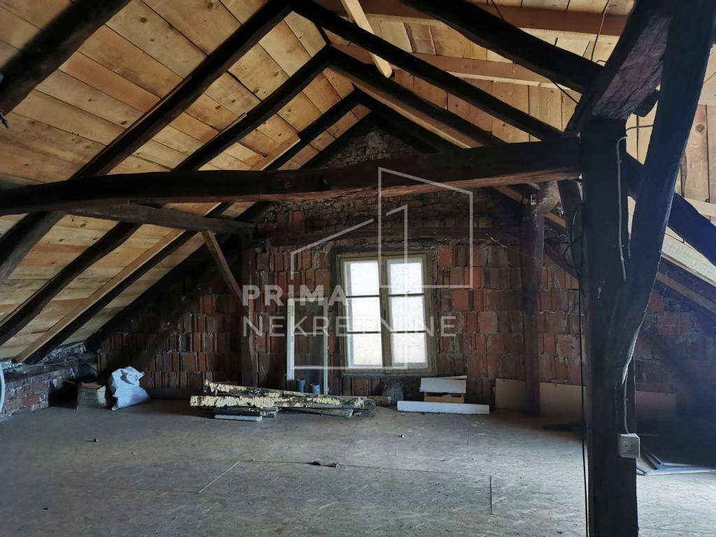 Prvi kat je neuređeno potkrovlje, veličine cca 60m2, koje može postati još jedna zasebna stambena jedinica sa vlastitim ulazom i velikom terasom s koje se pruža izvrstan pogled na zelenilo. Krovište je mijenjano prije 10 godina.