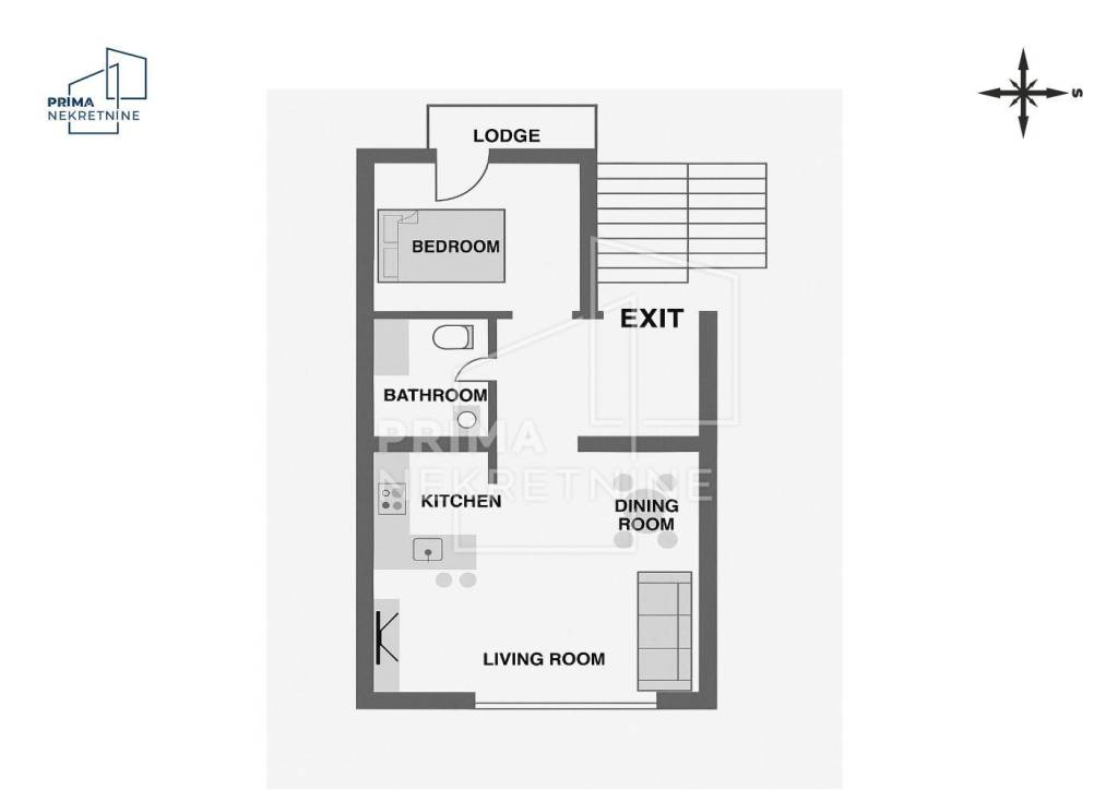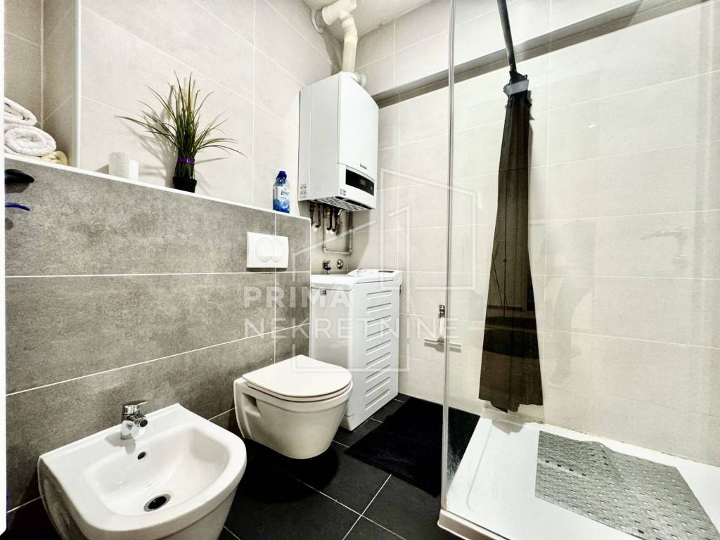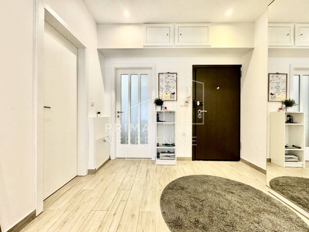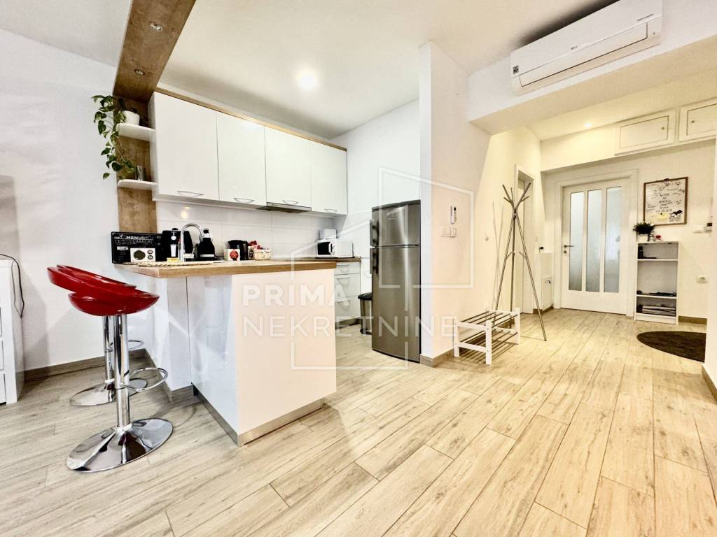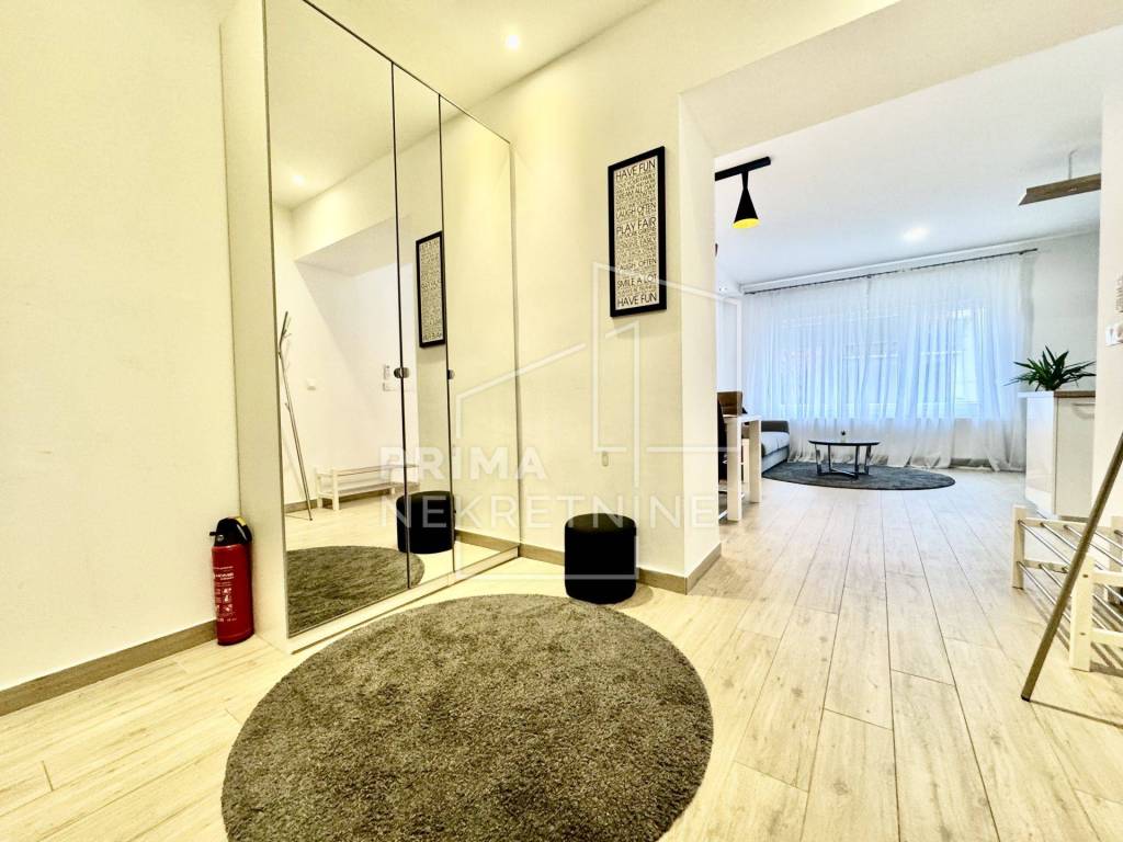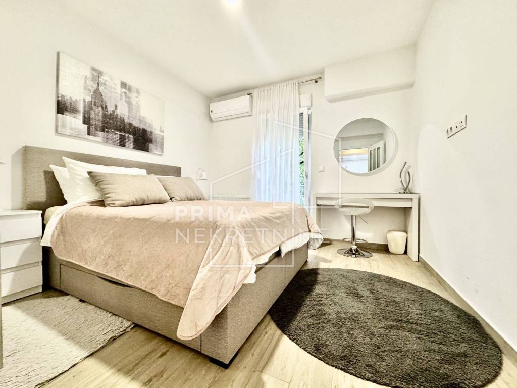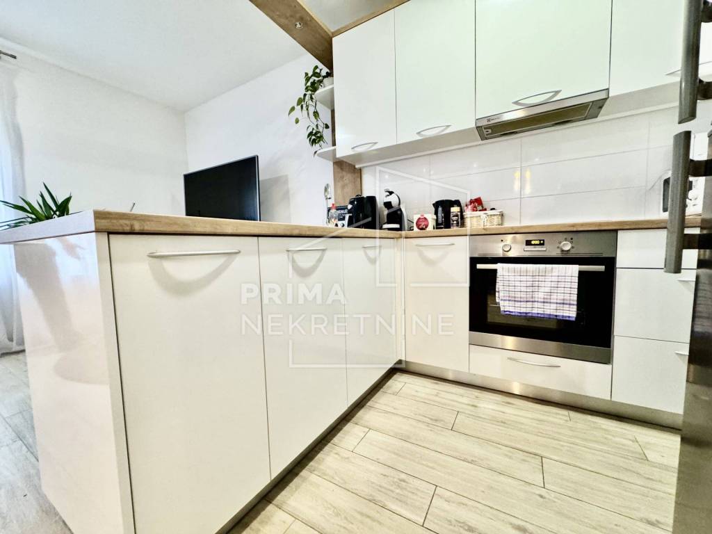 Sastoji se od prostranog “open space” dnevnog boravka s kuhinjom i blagovaonicom, spavaće sobe, kupaonice s WC-om, lođe i hodnika. Prodaje se potpuno namješten.