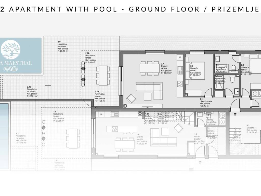 Stan se prostire na bruto površinu od 327,26 m², dok neto stambena površina iznosi 125,91 m². Sastoji se od prostranog open-space dnevnog boravka s kuhinjom i blagovaonicom, dvije udobne spavaće sobe, dvije moderno uređene kupaonice, ulaznog prostora i praktičnog vešeraja. Dodatnu vrijednost pružaju natkrivene i nenatkrivene terase, koje se savršeno nastavljaju na vanjski dio okućnice, gdje se nalazi vlastiti bazen površine 23,76 m², sunčalište, te lijepo uređena zelena i popločana površina, idealna za uživanje na otvorenom tijekom cijele godine.