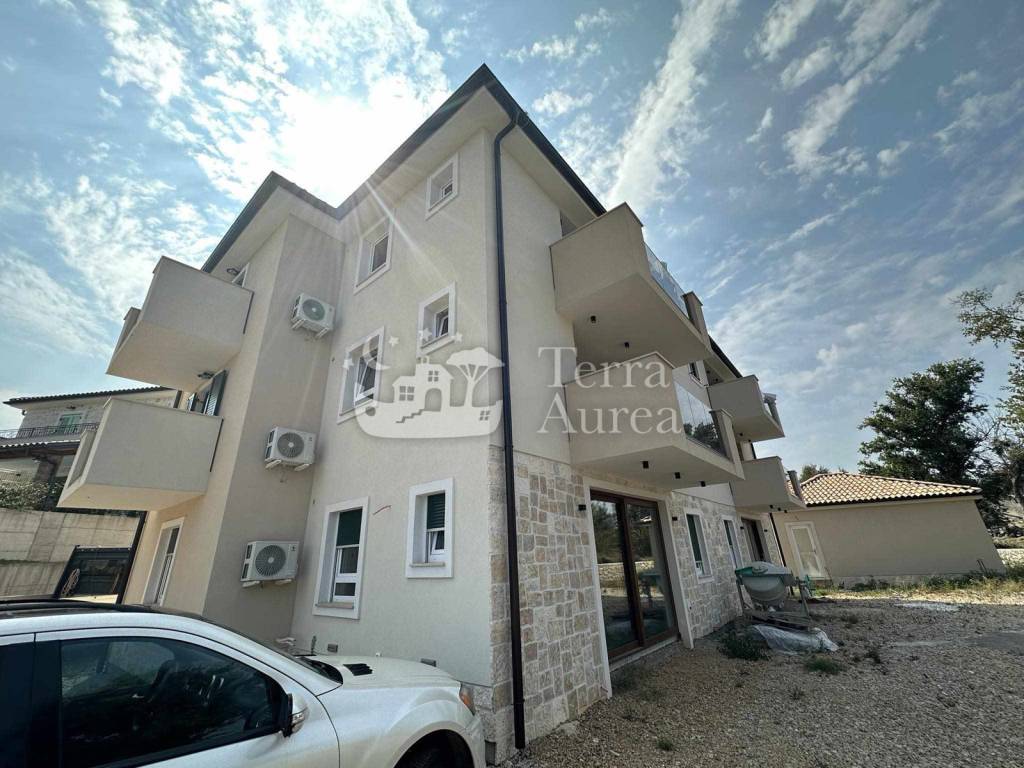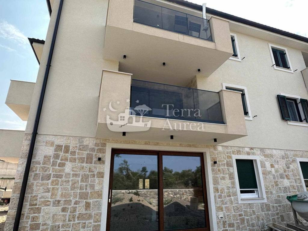 Ovaj veoma atraktivan apartman obuhvaća stambenu površinu od 150 m2 te se sastoji od hodnika, prostranog dnevnog boravka, kuhinje sa blagovaonicom, dvije spavaće sobe, kupaonice te spremišta u prizemlju površine 75 m2 (još jedan istovjetni apartman). Dnevni boravak ima izlaz na terasu s koje se pruža veoma lijepi pogled na netaknutu prirodu što nekretninu čini još atraktivnijom. Nekretnini pripada prostrana okućnica od 200 m2 na kojoj se nalaze parkirna mjesta za više vozila.