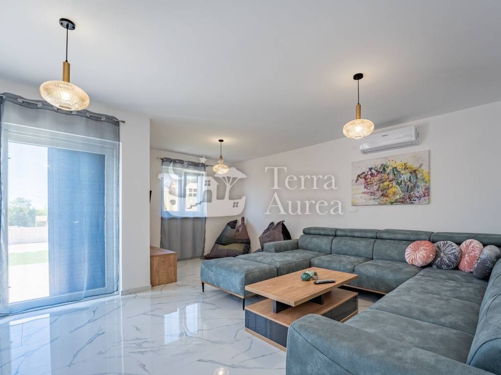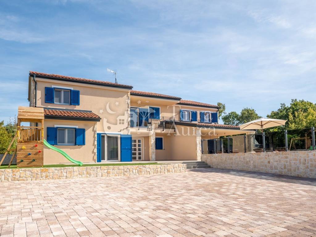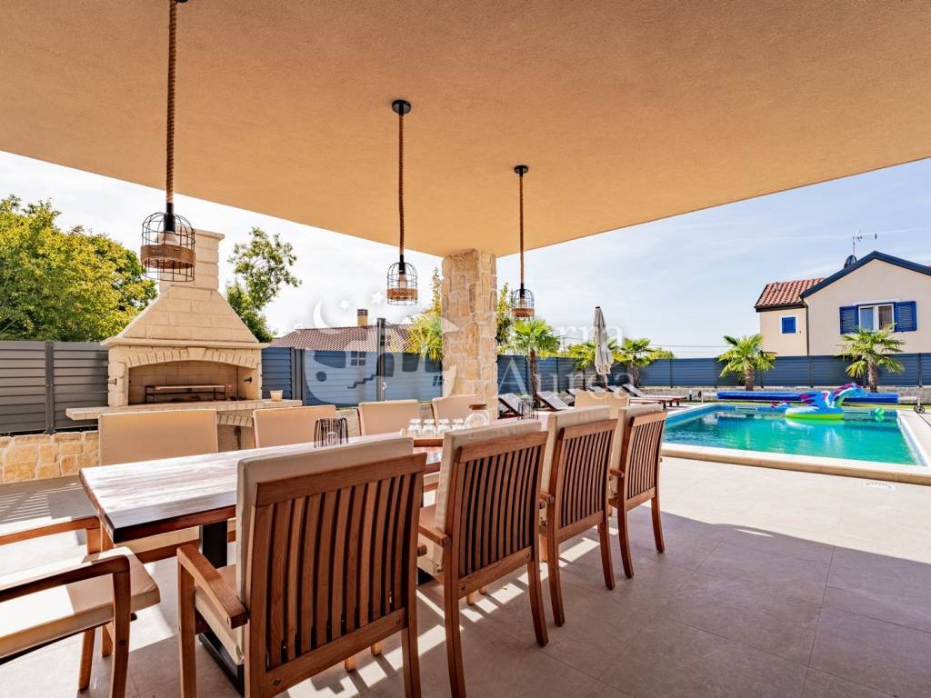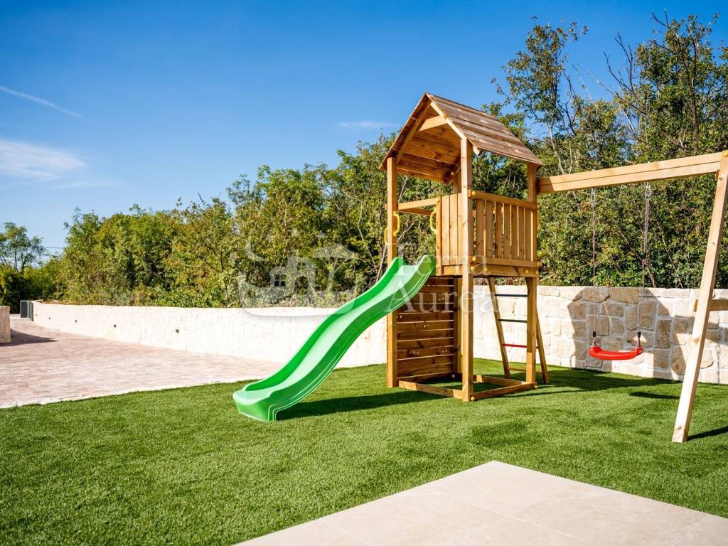 Okućnica je pažljivo uređena i bogata mediteranskim biljem, a njezin središnji dio čini grijani bazen površine 32 m2 sa sunčalištem. Uz bazen se nalazi dječje igralište te lounge zona s roštiljem i blagovaonicom na otvorenom što je idealno za ljetna druženja i uživanje u vanjskom prostoru.