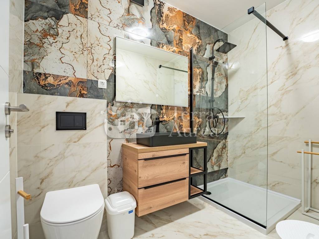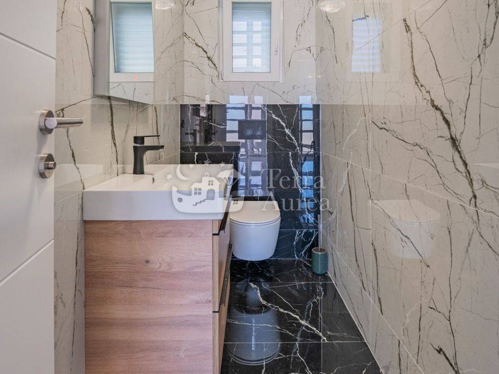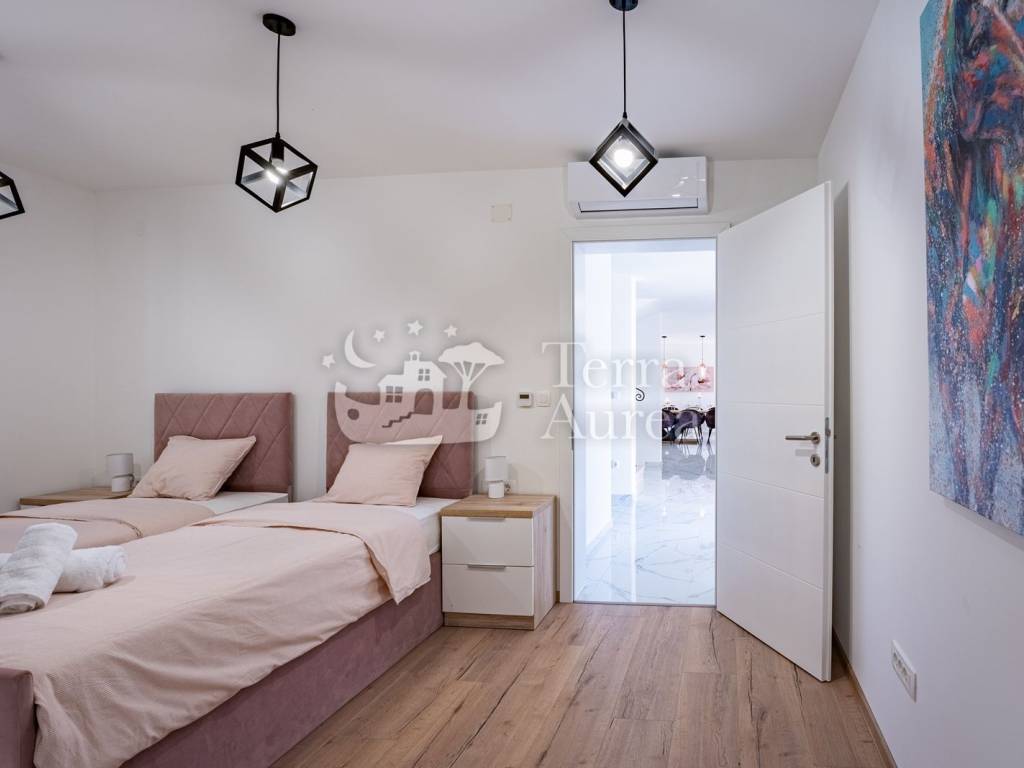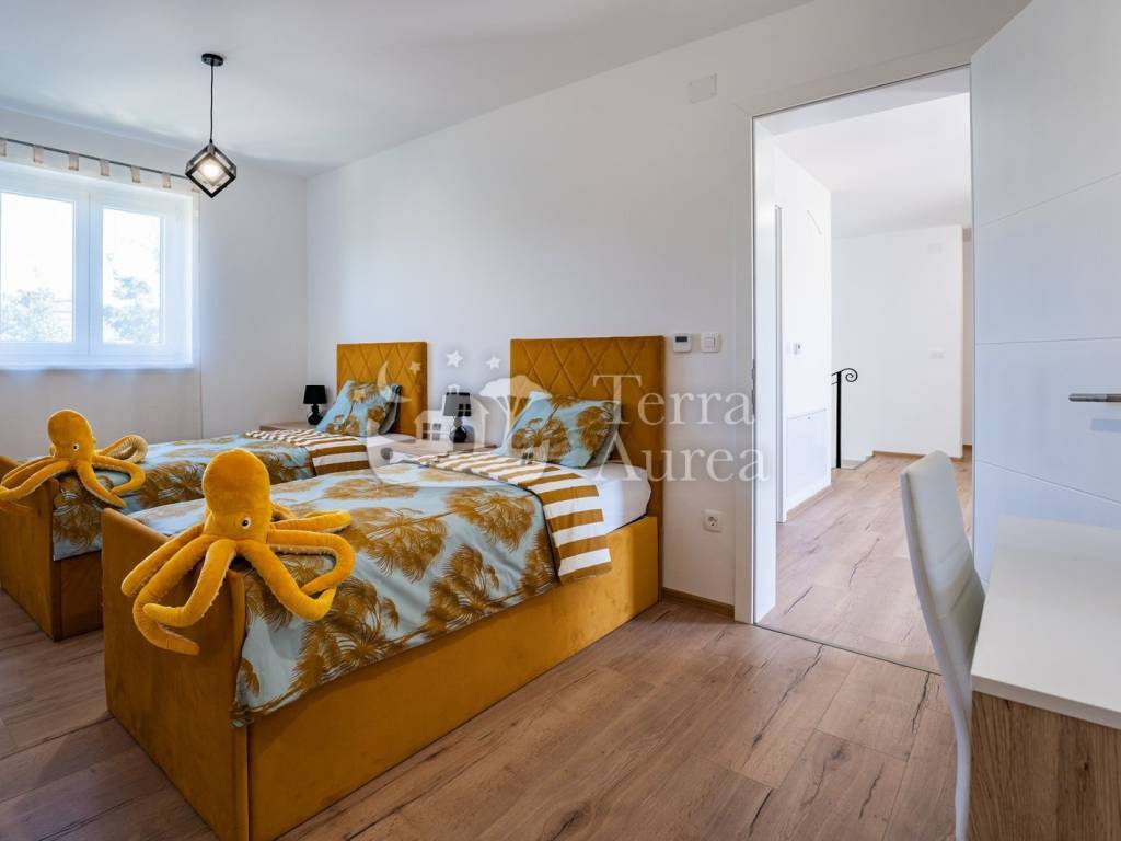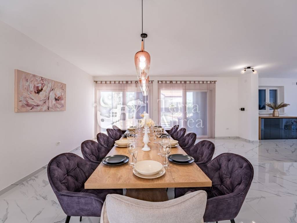 Prizemlje je osmišljeno kao open space dnevni prostor s kuhinjom i blagovaonicom koji se prirodno nadovezuju na prostranu natkrivenu terasu s pogledom na bazen i lijepo uređen vrt. U ovoj etaži smještena je i jedna spavaća soba s vlastitom kupaonicom te dodatni toalet.