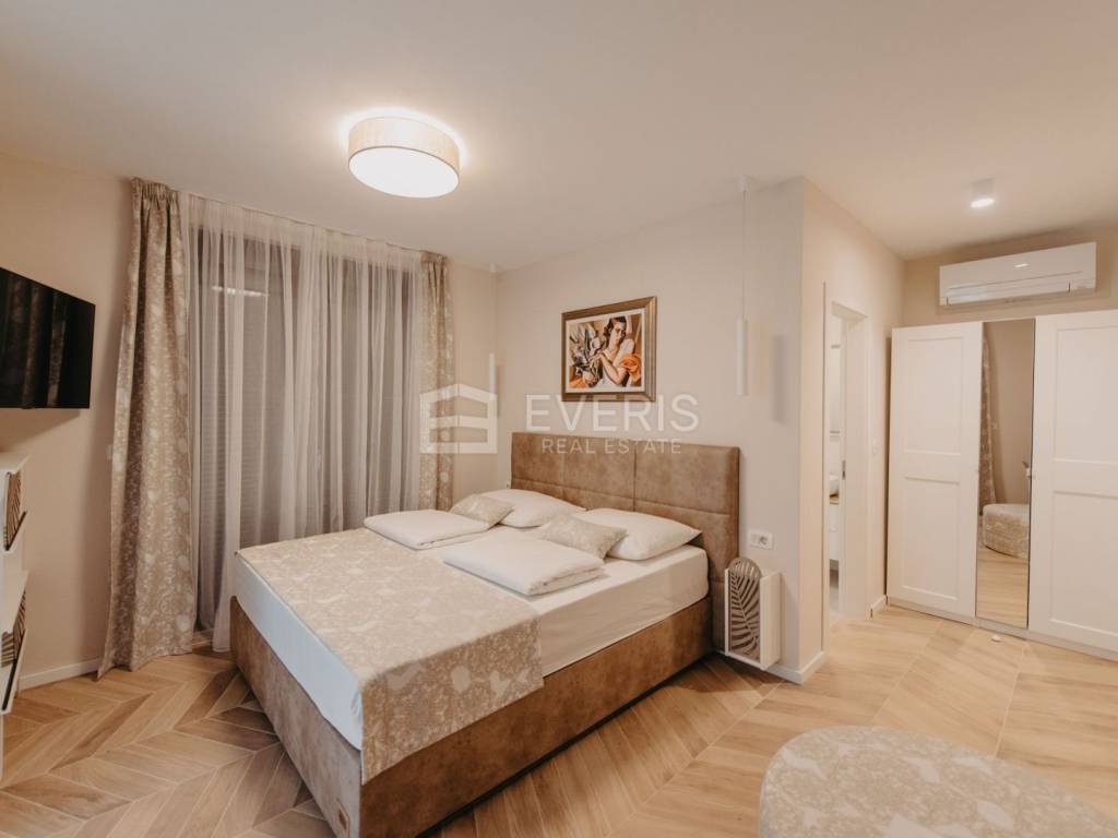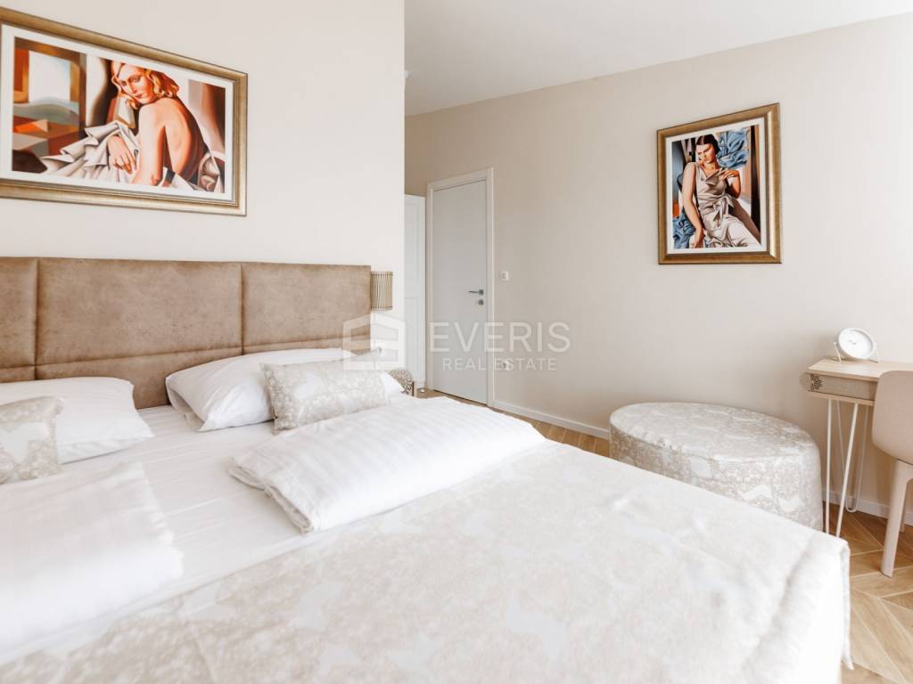 Jedna od dviju spomenutih soba s bračnim krevetima zapravo je prostrana master soba s toaletom (23m2) koja se nastavlja na veliku uređenu terasu (33m2) s vanjskim jacuzzijem.