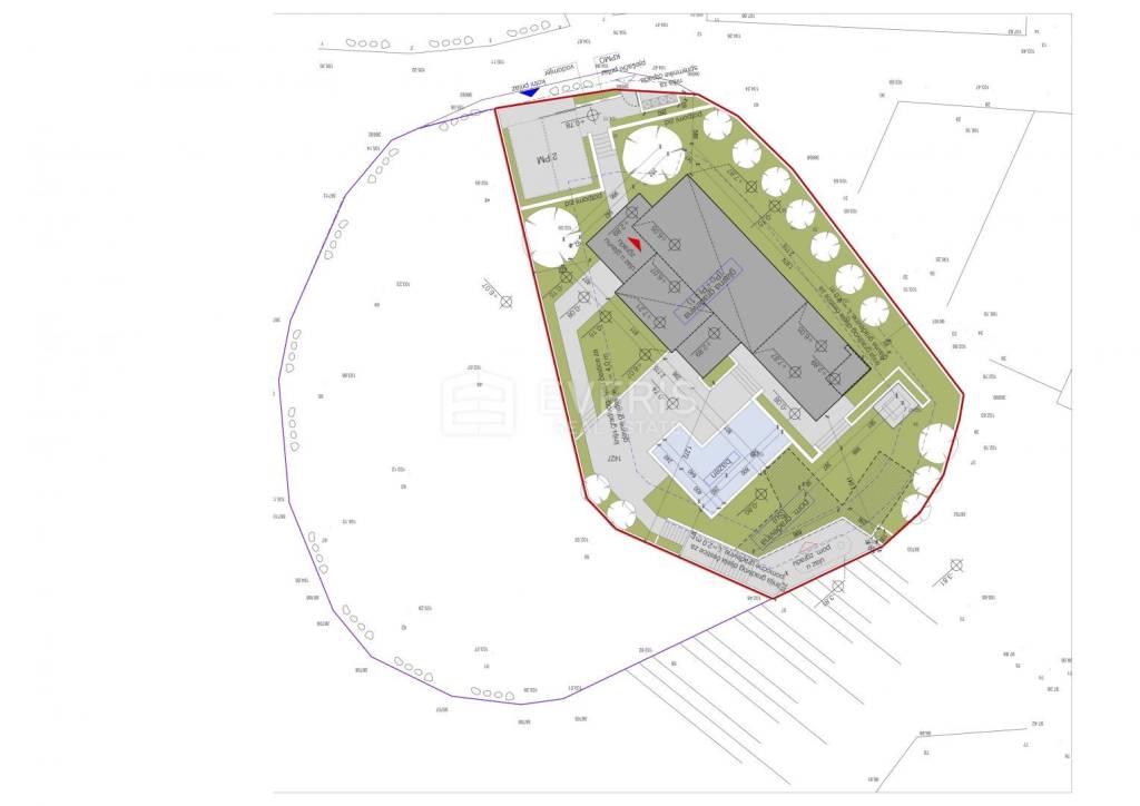 Kuća ima više parkirnih mjesta, na donjem dijelu parcele nalazi se garaža (29 m2) za dva automobilska mjesta te dodatnom prostorijom za ostavu i strojarnicu bazena (17,34 m2). Ispred ulaza u okućnicu kuće nalaze se parkirna mjesta za goste kao i na prilazu sa stražnje strane kuće s dodatna dva parkirna mjesta.