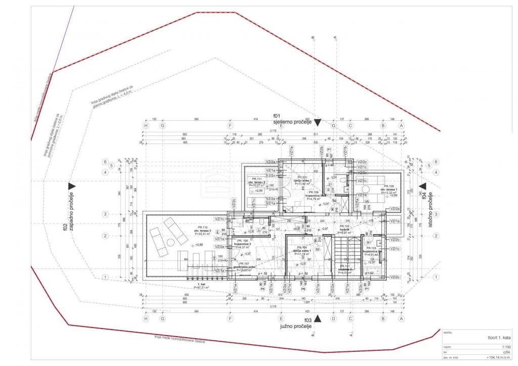• Kat; ukupne površine 132,84 m2 sastoji se od: stubišta, hodnika, tri kupaonice i tri spavaće sobe;