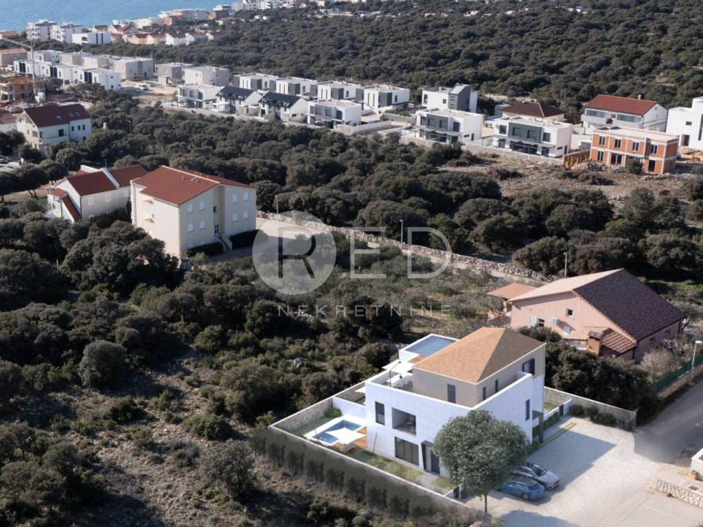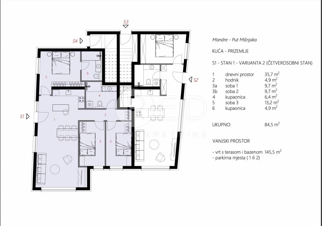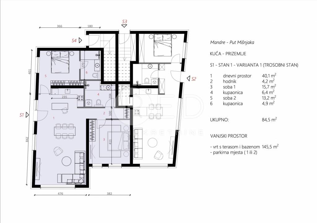 Površine Bruto površina vrta s terasom i bazenom je 145,5m2 Grijani prostor stana je 84,5m2 Ukupna površina stana s pripadcima i uračunatim koeficijentima je 104,05 m2
