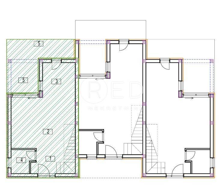 Prizemlje se sastoji od dnevnog boravka i blagovaonice, kuhinje, WC-a i natkrivene terase