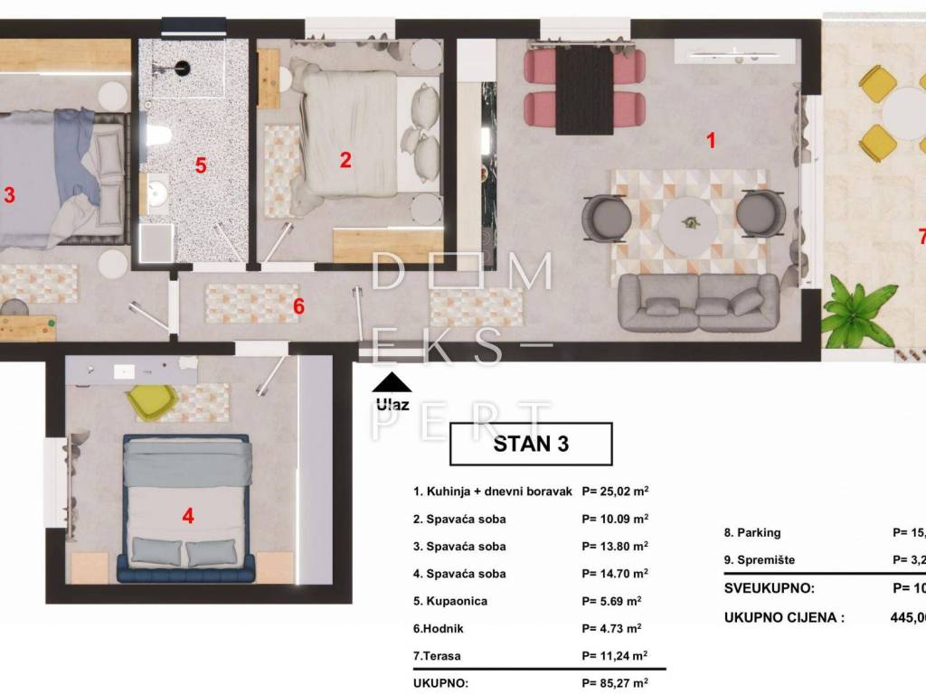 - ukupna površina stana s pripadcima 103.47 m² (terasa, parkirno mjesto, spremište)