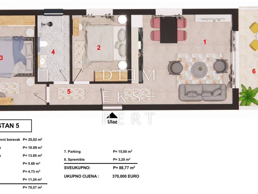 - ukupna površina stana s pripadcima 88.77 m² (terasa, parkirno mjesto, spremište)