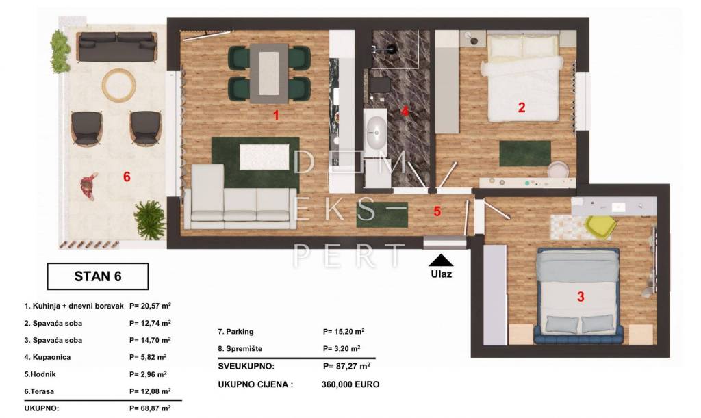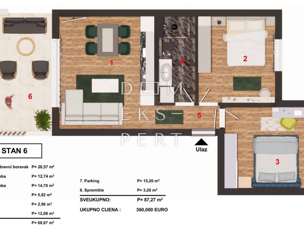 - ukupna površina stana s pripadcima iznosi 87,27 m² (terasa, parkirno mjesto, spremište)