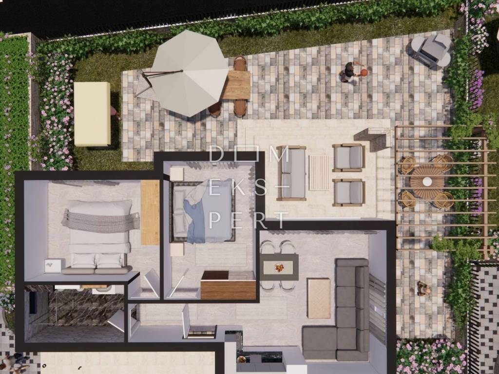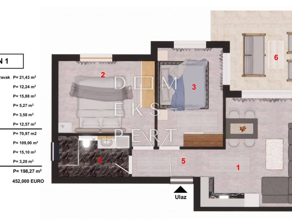 - ukupna površina stana s pripatcima 198.27 m² (vrt, terasa, parkirno mjesto, spremište)