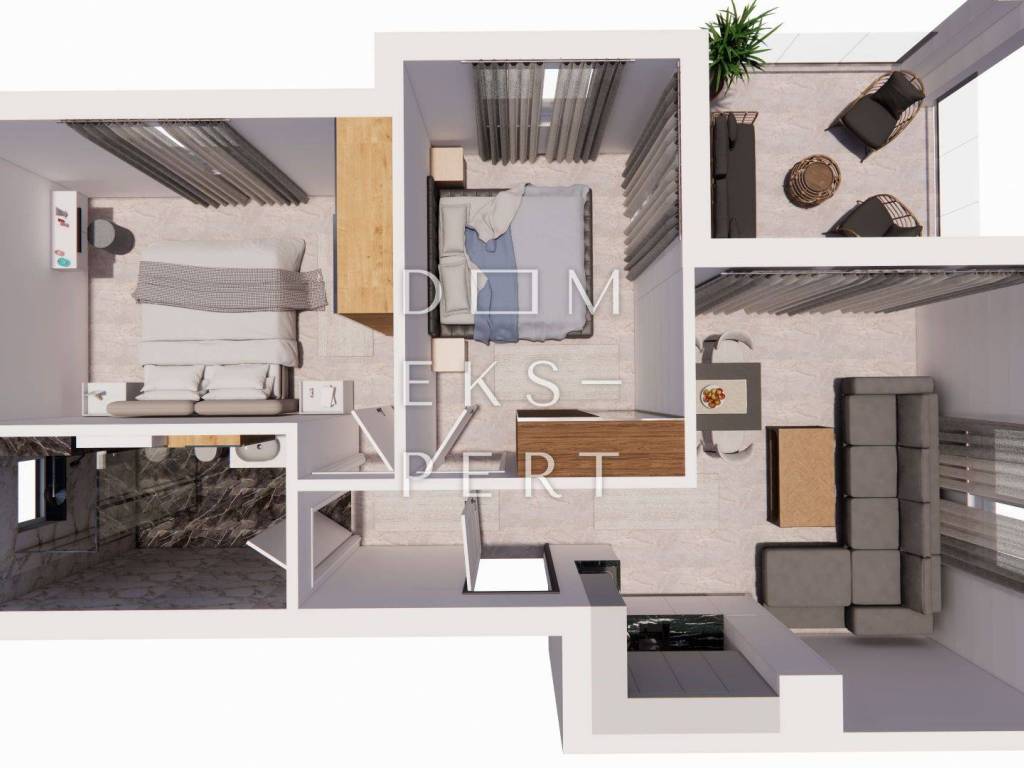 Stan je orijentiran na zapadnu, istočnu i sjevernu stranu svijeta. Orijentacija stana osigurava puno dnevnog svjetla kroz velike staklene stijene, a prostrana terasa s nudi idealan prostor za odmor.
