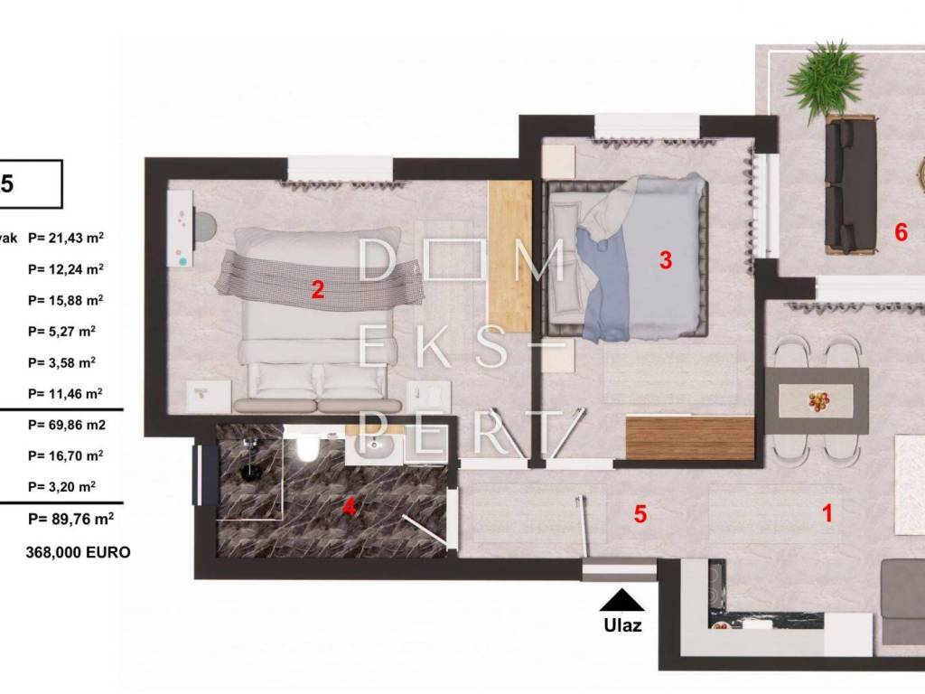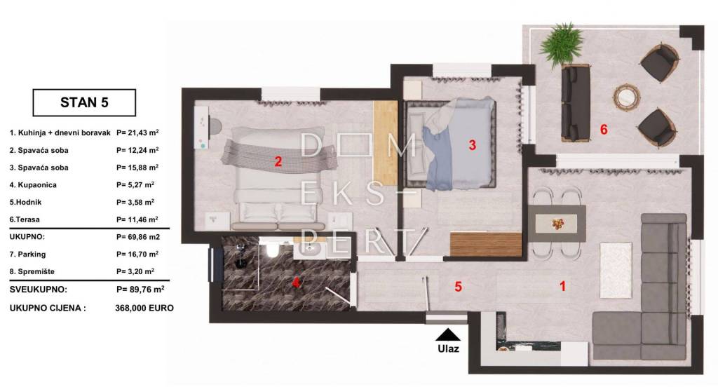 - ukupna površina stana s pripadcima 89.76 m² (terasa, parkirno mjesto, spremište)