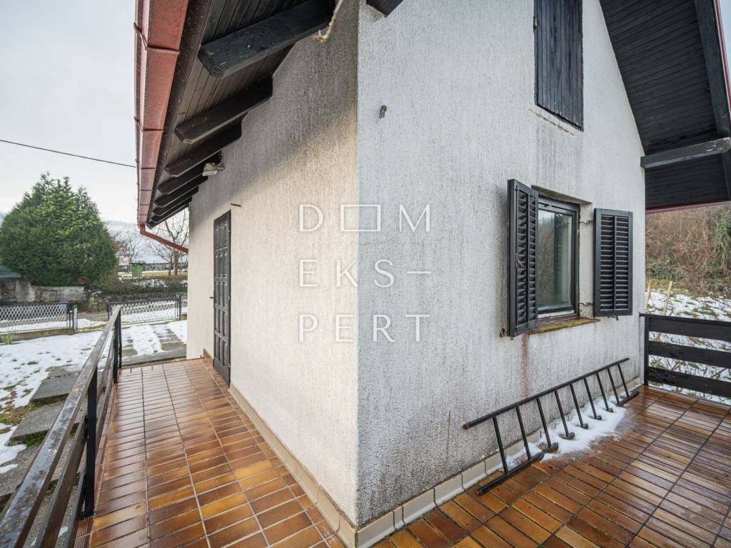 Fasada na kući je klasična, a vanjska stolarija je drvena s žaluzinama.