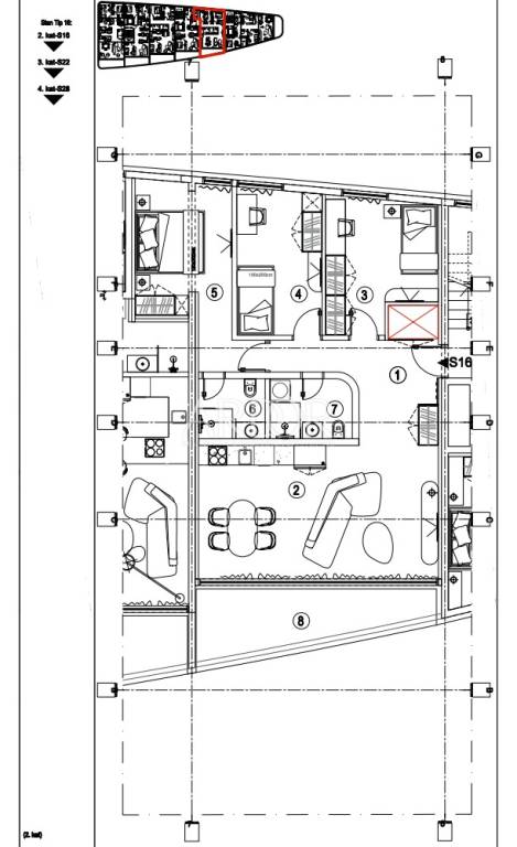 Drugi kat, stan S16, neto površine 96,18 m2. Sastoji se od ulaznog hodnika (10,13m2), open space koncepta kuhinje, blagovaonice i dnevnog boravka (28,80m2) iz kojeg se izlazi na balkon veličine 11,80m2 sa koje se pruža prekrasan pogled na more, tri spavaće sobe od kojih je jedna veća (14,16m2) sa vlastitom kupaonom (3,60m2), dvije manje sobe (12,18 i 11,12m2) te kupaonice (4,39m2). Stanu pripada i parkirno mjesto br. 30, površine 13,15 m2 te spremište br. 3 površine 4,72 m2.