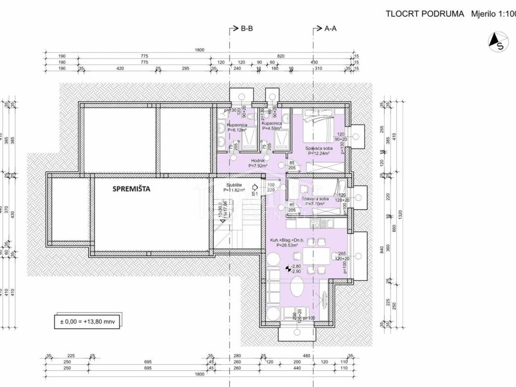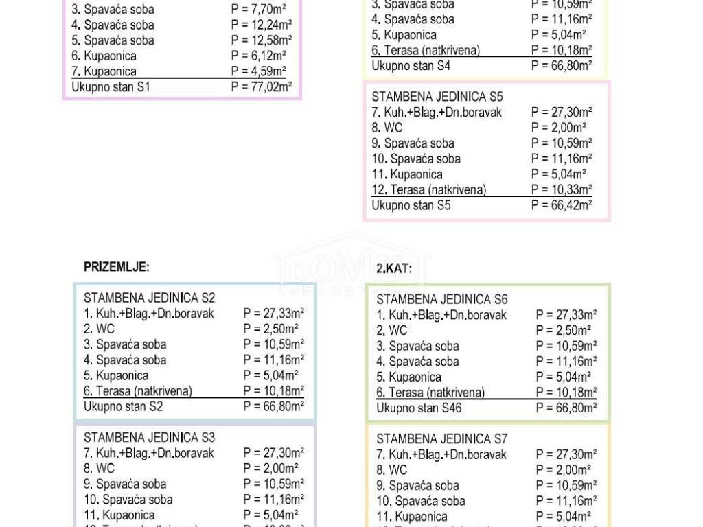 STAMBENA JEDINICA S1, nalazi se u suterenskoj etaži, ima sveukupnu korisnu površinu od 77,02m2, orijentirana je na jugoistočnu stranu, sastoji se od dnevnog boravka, kuhinje i blagovaonice, tri spavaće sobe, dvije kupaonice, te popločani dio dvorišta / terasa površine 30m2. Stanu pripada jedno parkirno mjesto te jedno spremište.