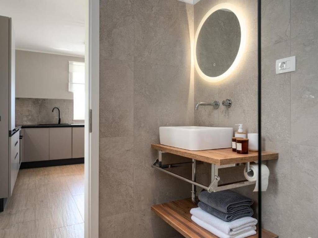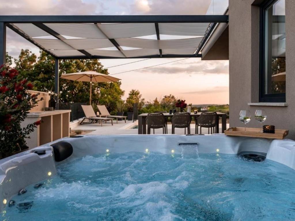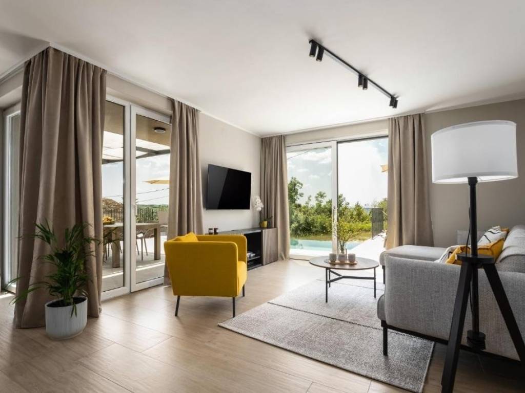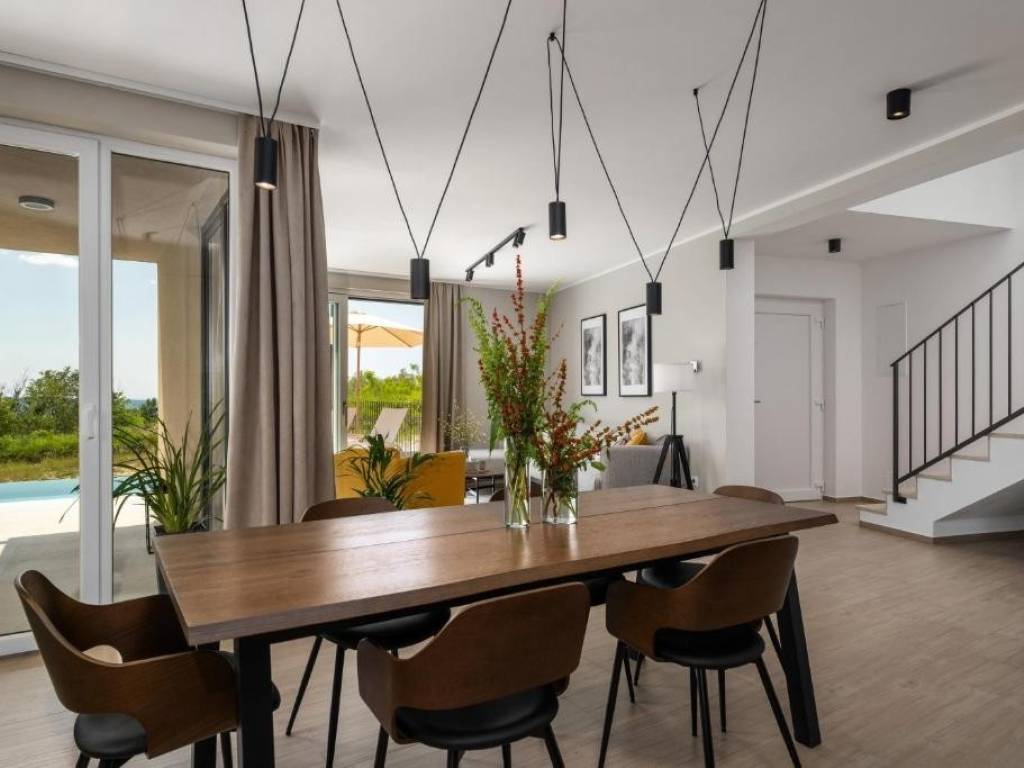 U prizemlju je veliki dnevni boravak sa open space prostorom, toalet, kuhinja i blagovaona s predivnim kuhinjskim otokom, iz kojeg prostora se izlazi na vanjski dio dvorišta gdje se smjestio infinity bazen , površine 25 m2, vanjski jacuzzi, ali i veliki prostor za zajednička druženja i uživanje koji je natkriven.
